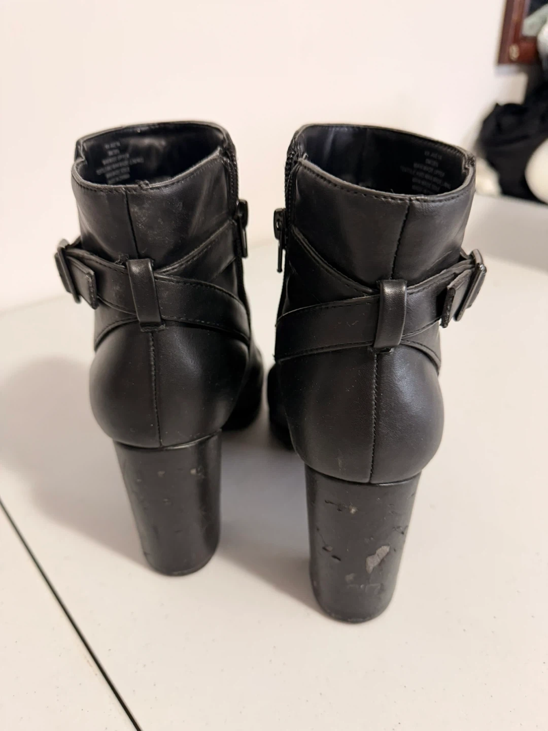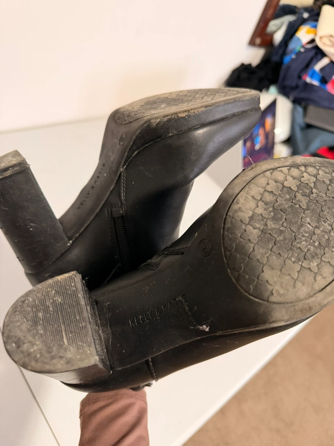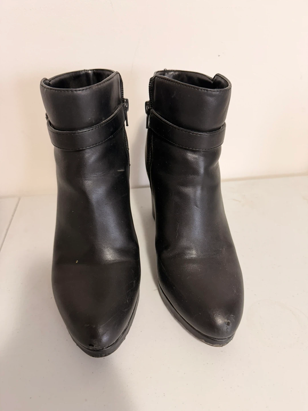 These black ankle boots are by Kelly & Katie. They feature a man-made upper, lining, and sole. They're a size 8M, with a side zipper and buckle detail.