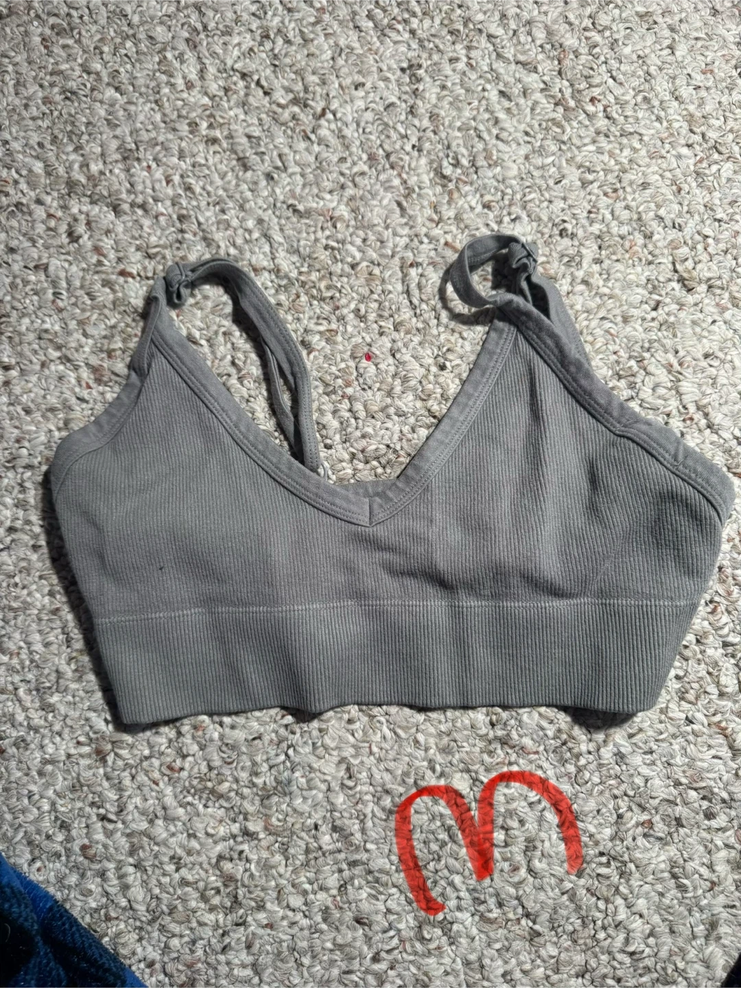 A comfortable grey ribbed sports bra. It's size medium and made of a stretchy fabric. The adjustable straps offer a custom fit. It's great for light workouts or everyday wear!