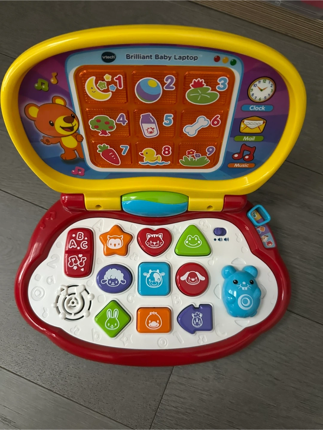 This VTech Brilliant Baby Laptop is a fun educational toy for little ones. It has buttons with letters, numbers, and animal sounds. It also features a clock and mail function.