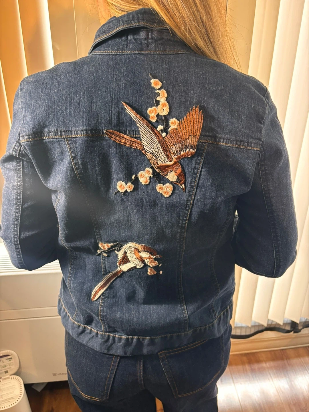 Cute denim jacket with unique bird embroidery on the back! It's a stylish piece that adds a bit of flair to any outfit. Perfect for layering or wearing on its own during the warmer months