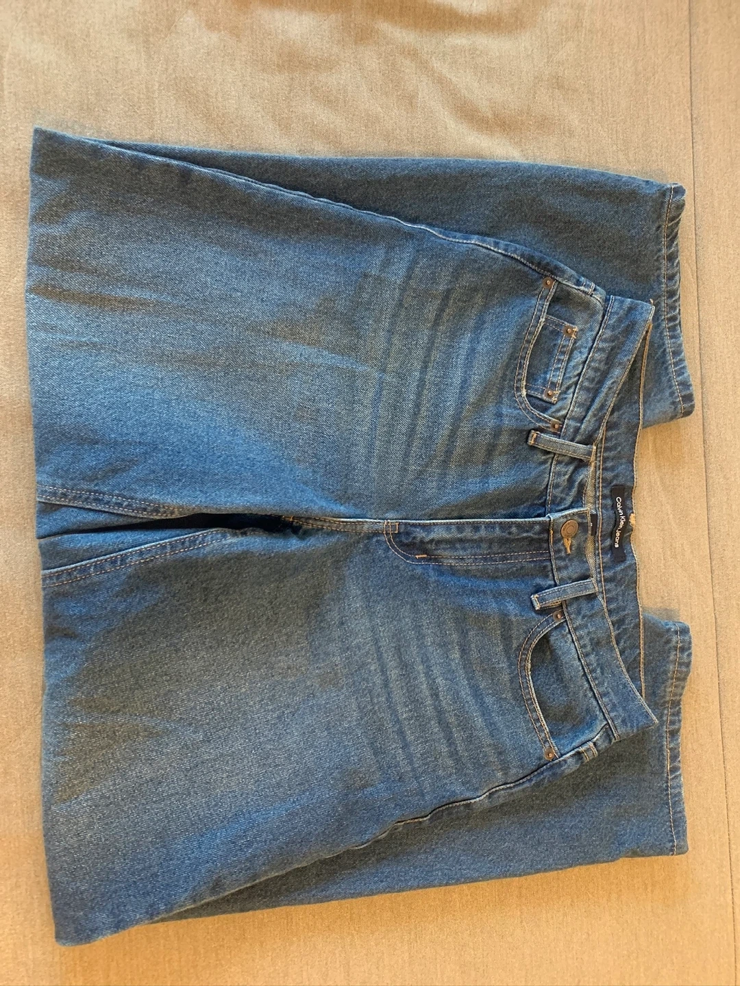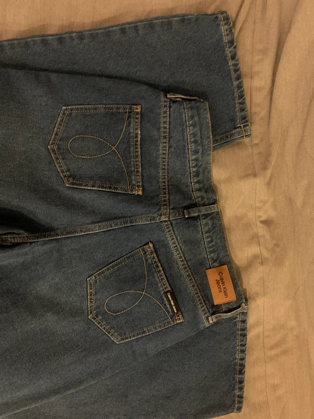 Blue denim jeans by Calvin Klein. These jeans are made from cotton and feature a classic five-pocket design. They offer a comfortable fit for everyday wear.