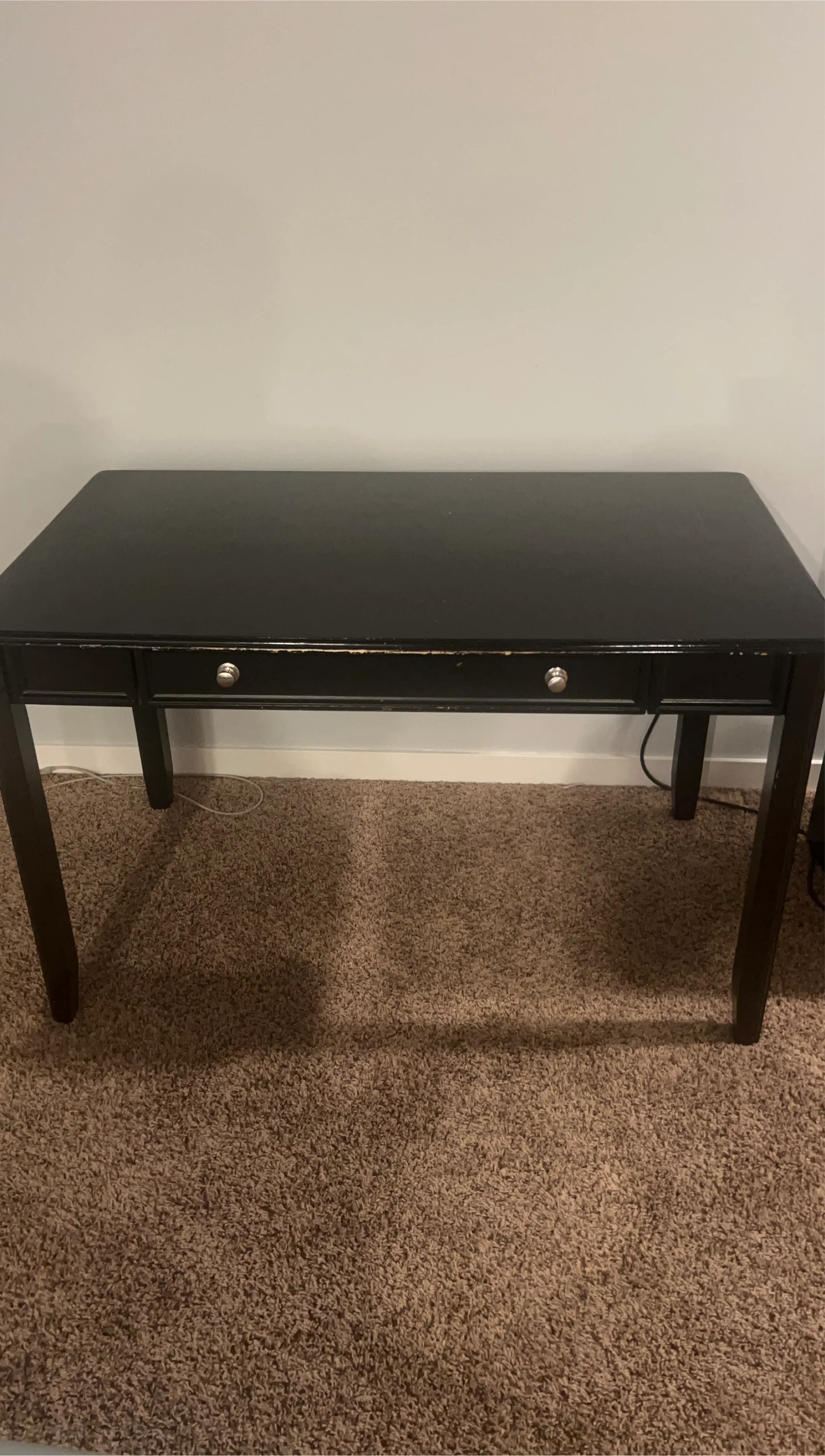Selling a black wooden desk. It has some signs of use, as shown in the pictures.