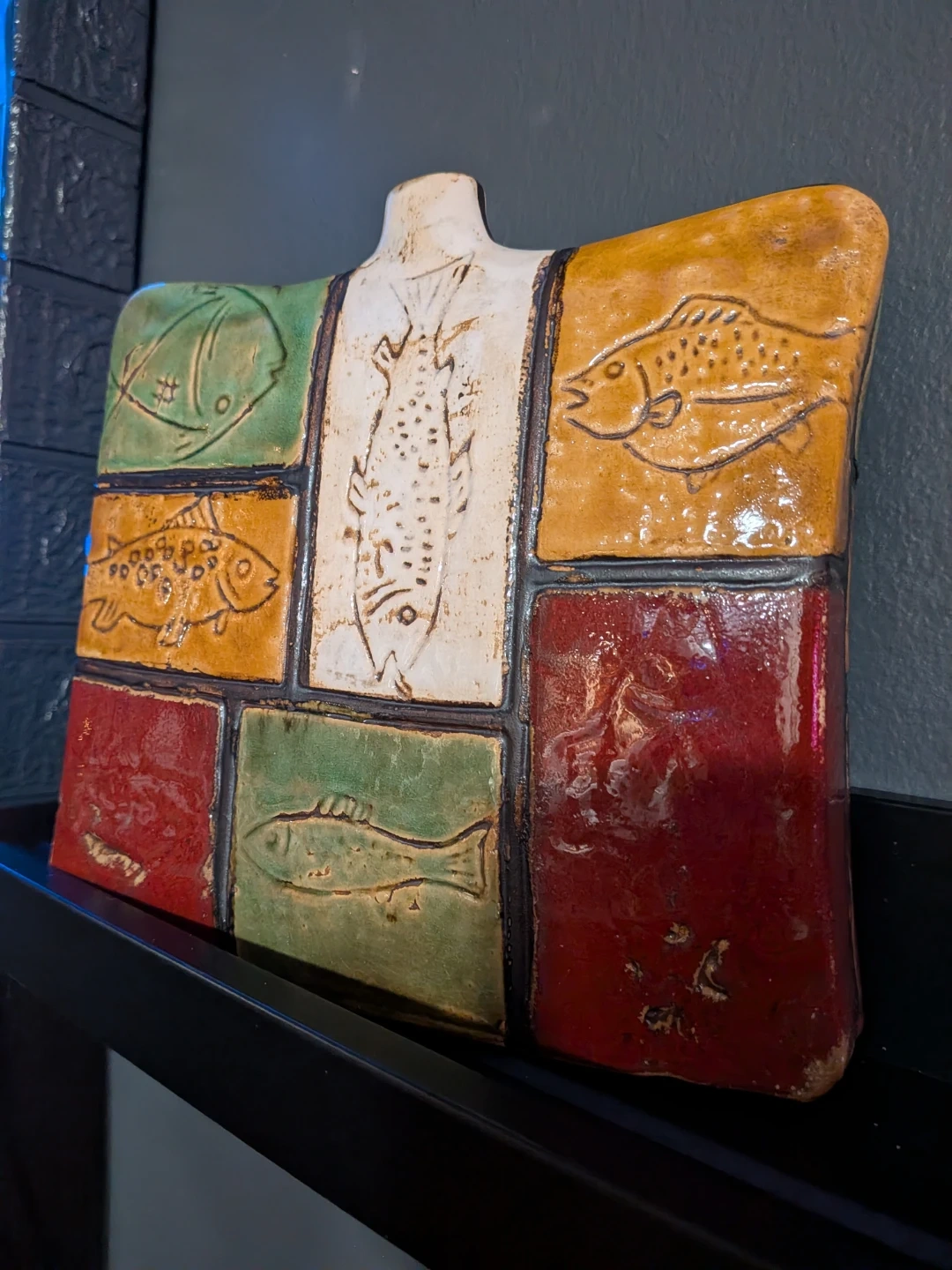 Handmade ceramic decorative plaque featuring embossed fish designs. It's finished in a mix of glaze colours including white, green, yellow, and red. This unique piece adds an artisanal touch to any space.