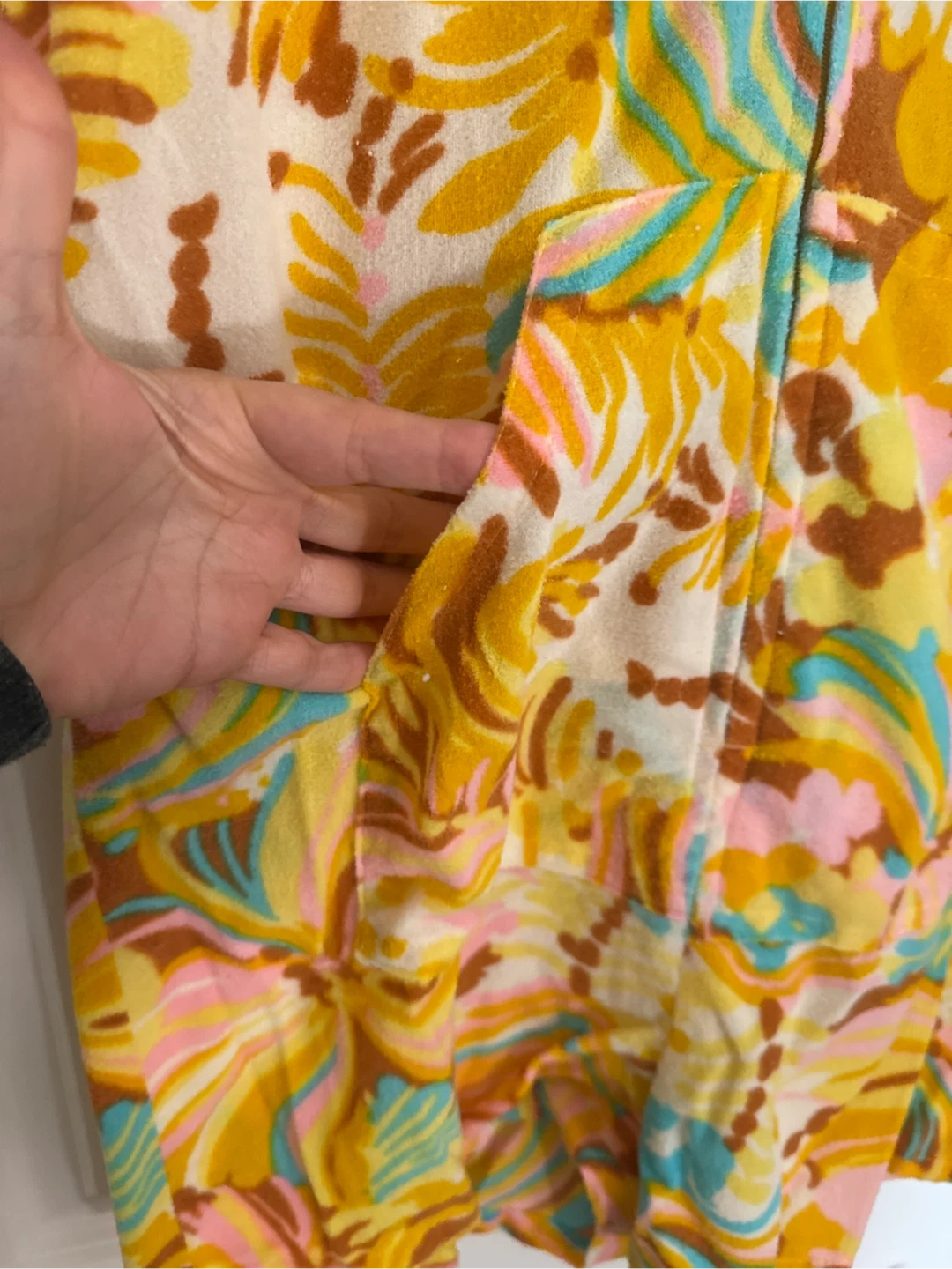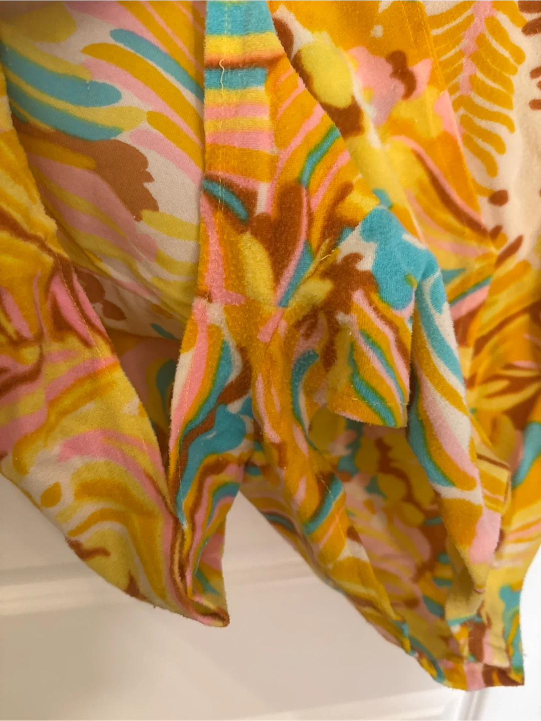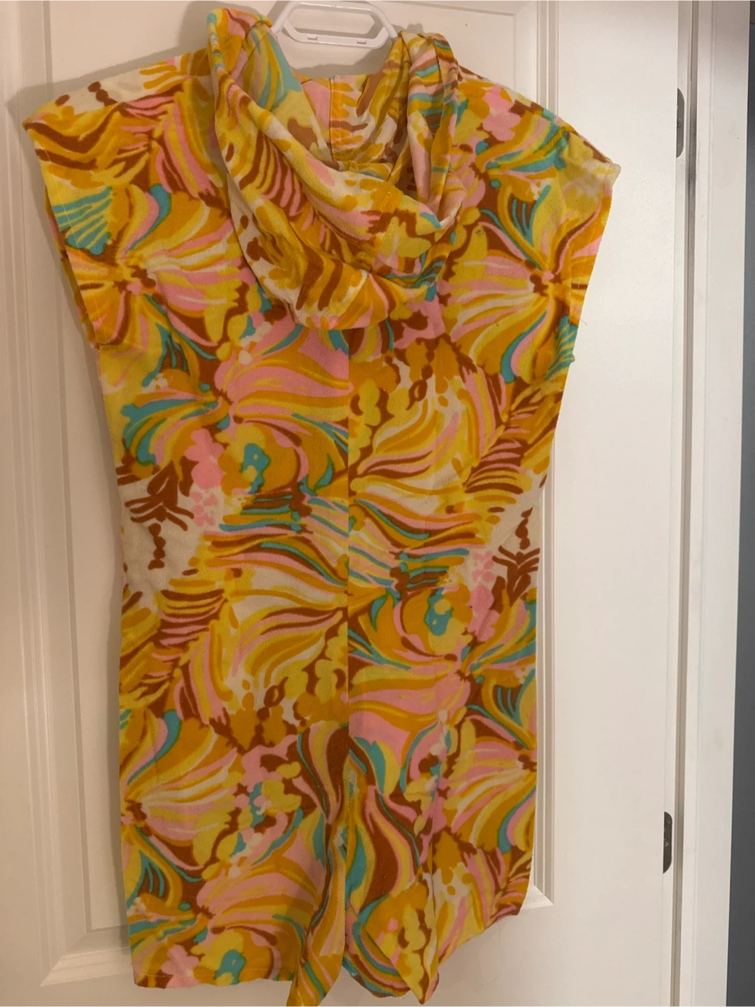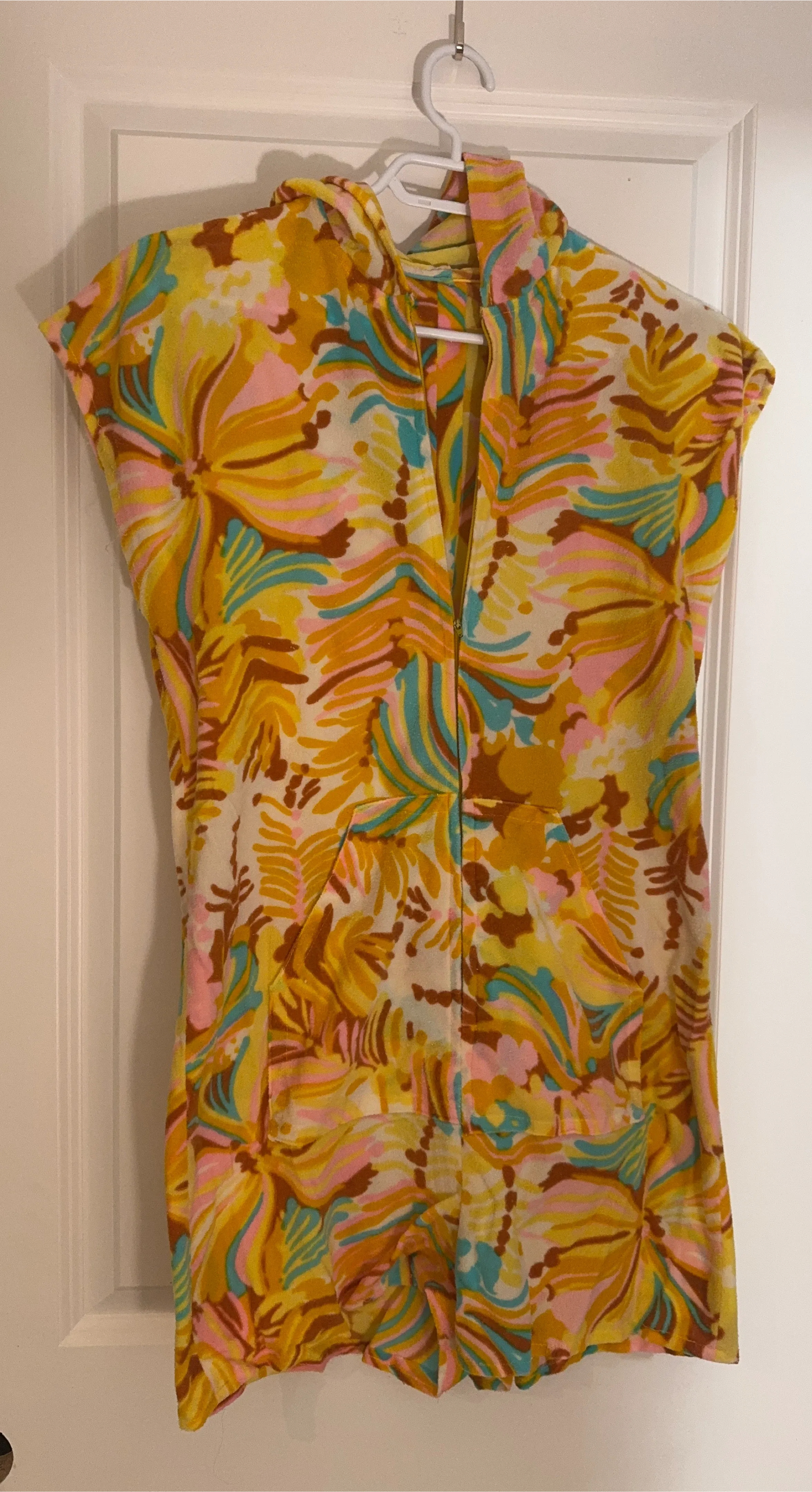 Selling a cute floral print terry romper! Handmade by mom in the 1970s as a beach cover up. It features a colourful design with yellow, pink, brown, and blue accents. There's also a hood and a pocket on the front. Perfect for lounging or a casual day out