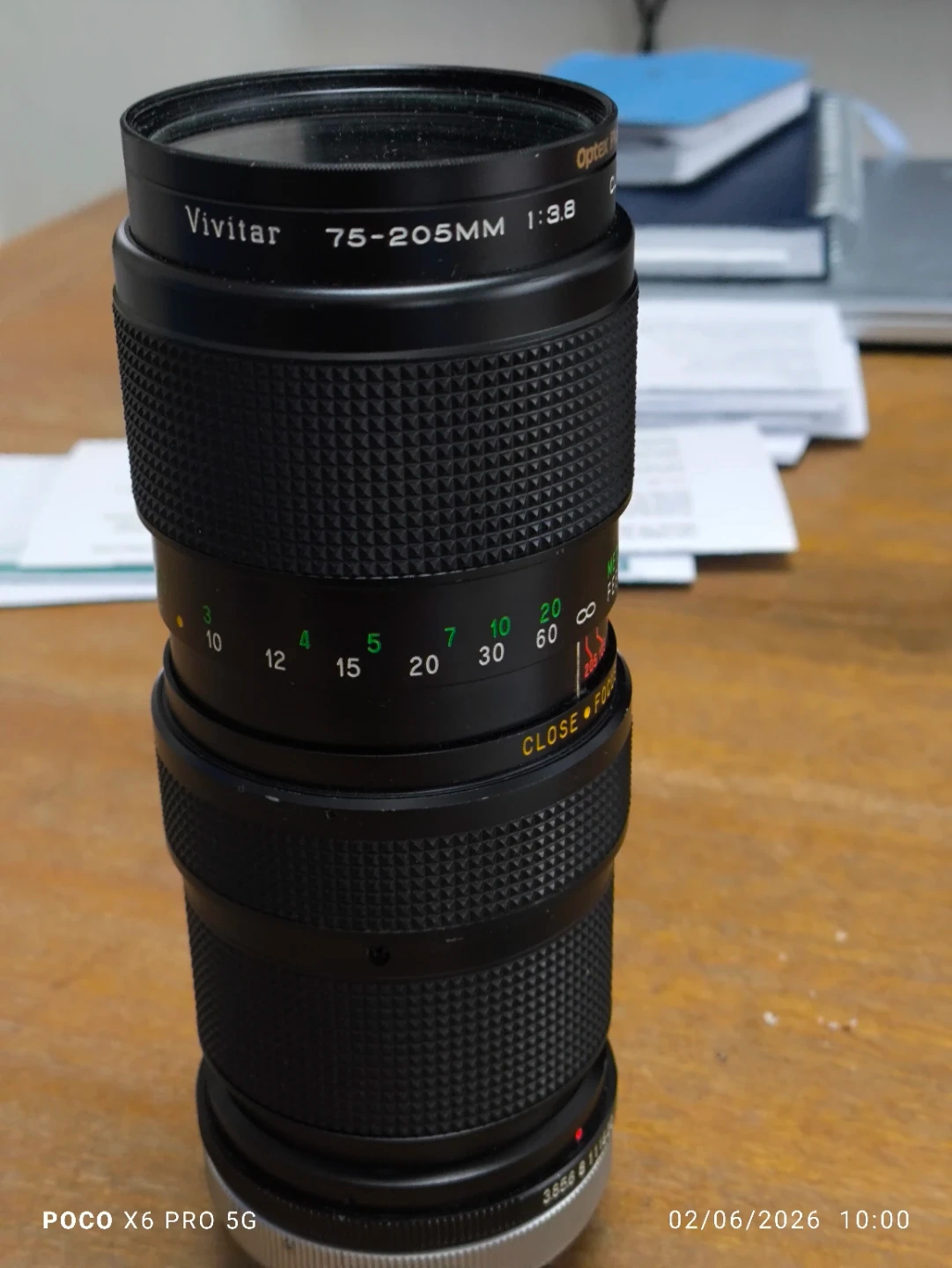 This is a Vivitar 75-205mm zoom lens with a maximum aperture of f/3.8. It has a filter thread size of 58mm. This lens offers close focusing capabilities. Great for telephoto shots!