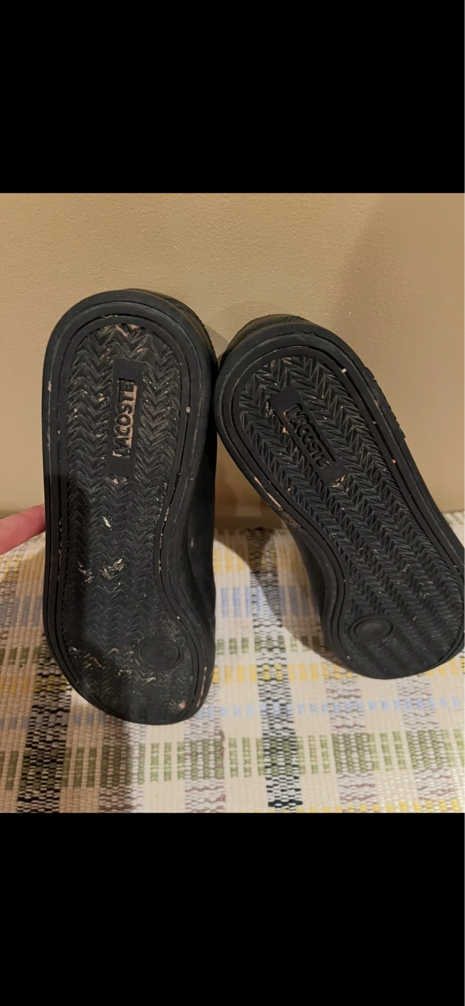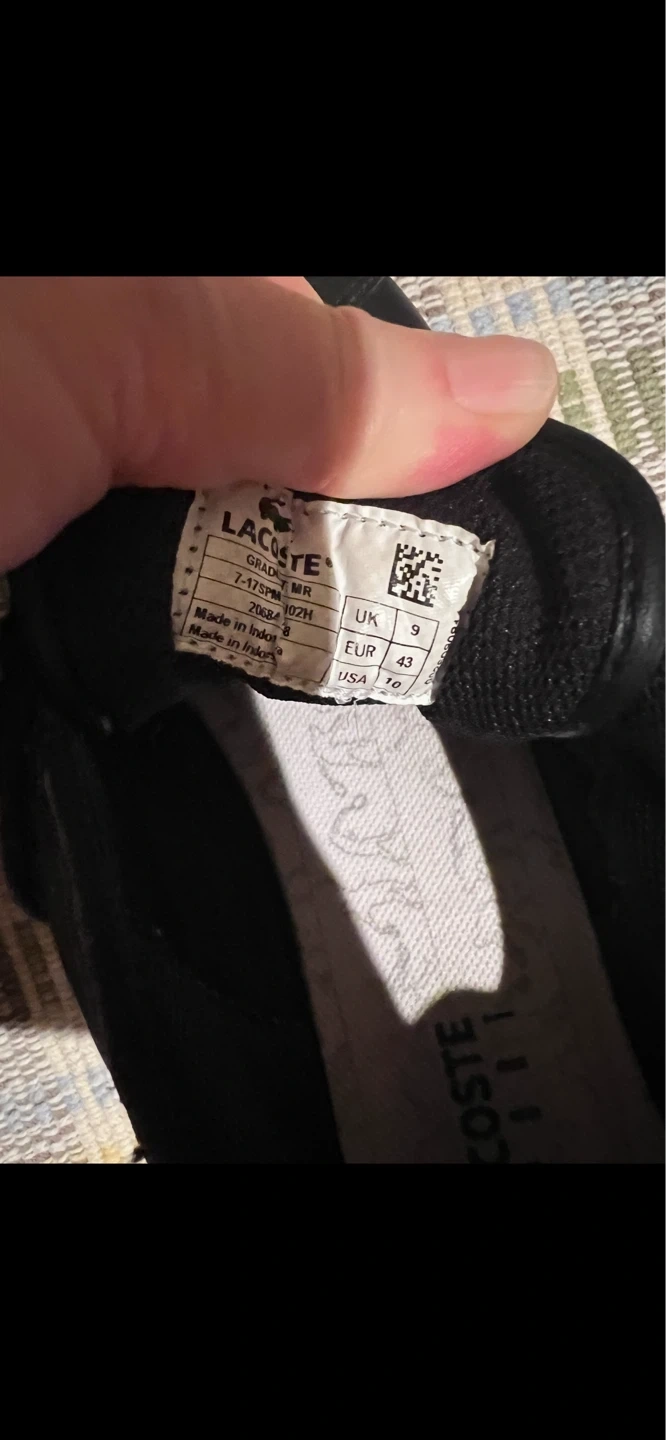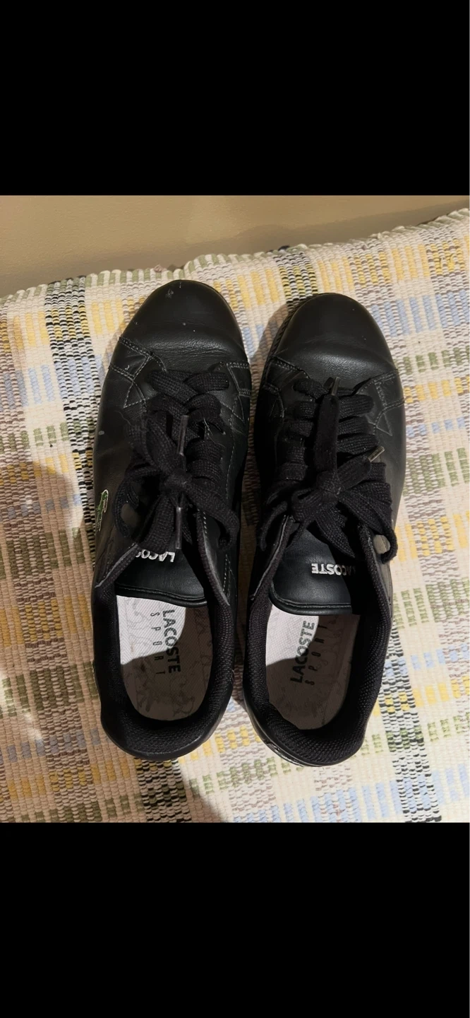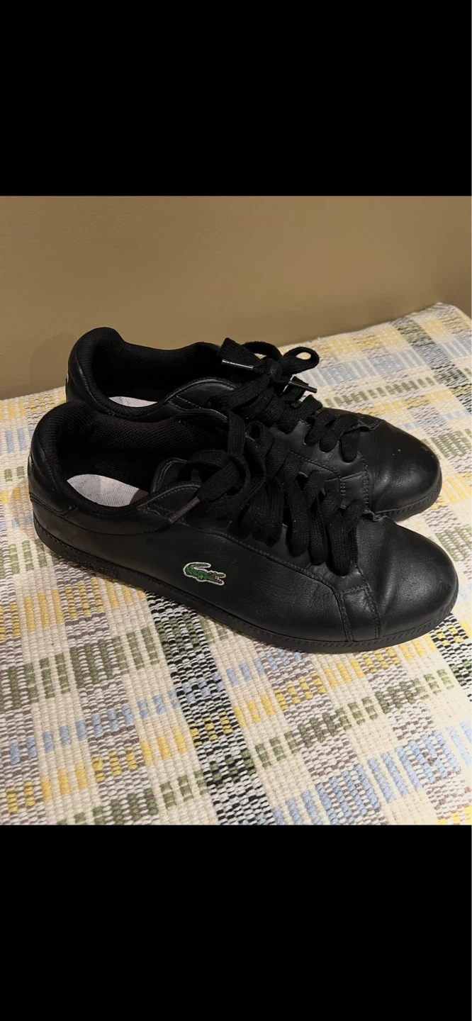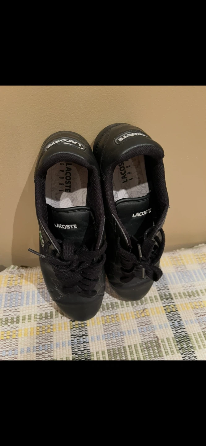Black leather Lacoste Sport sneakers for men. These shoes feature a classic design with laces. They're a size 10 US. Great for everyday wear!