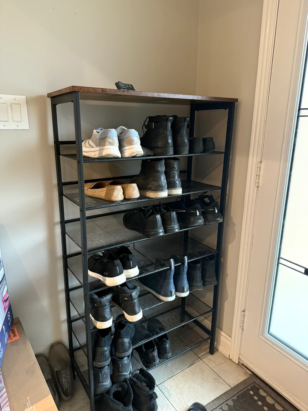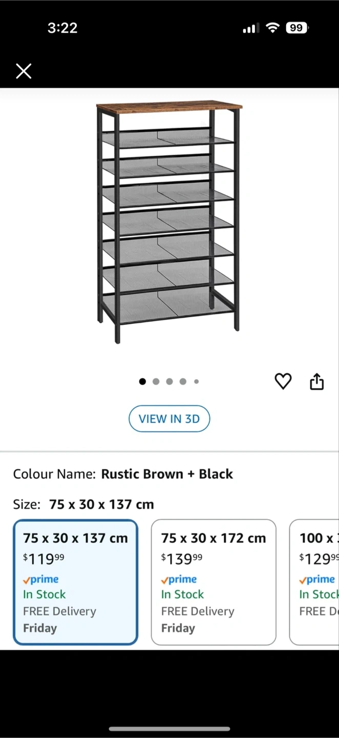This 7-tier shoe rack offers ample storage space for your footwear collection. It's constructed with a rustic brown top and black metal frame. Dimensions are 75 x 30 x 137 cm.