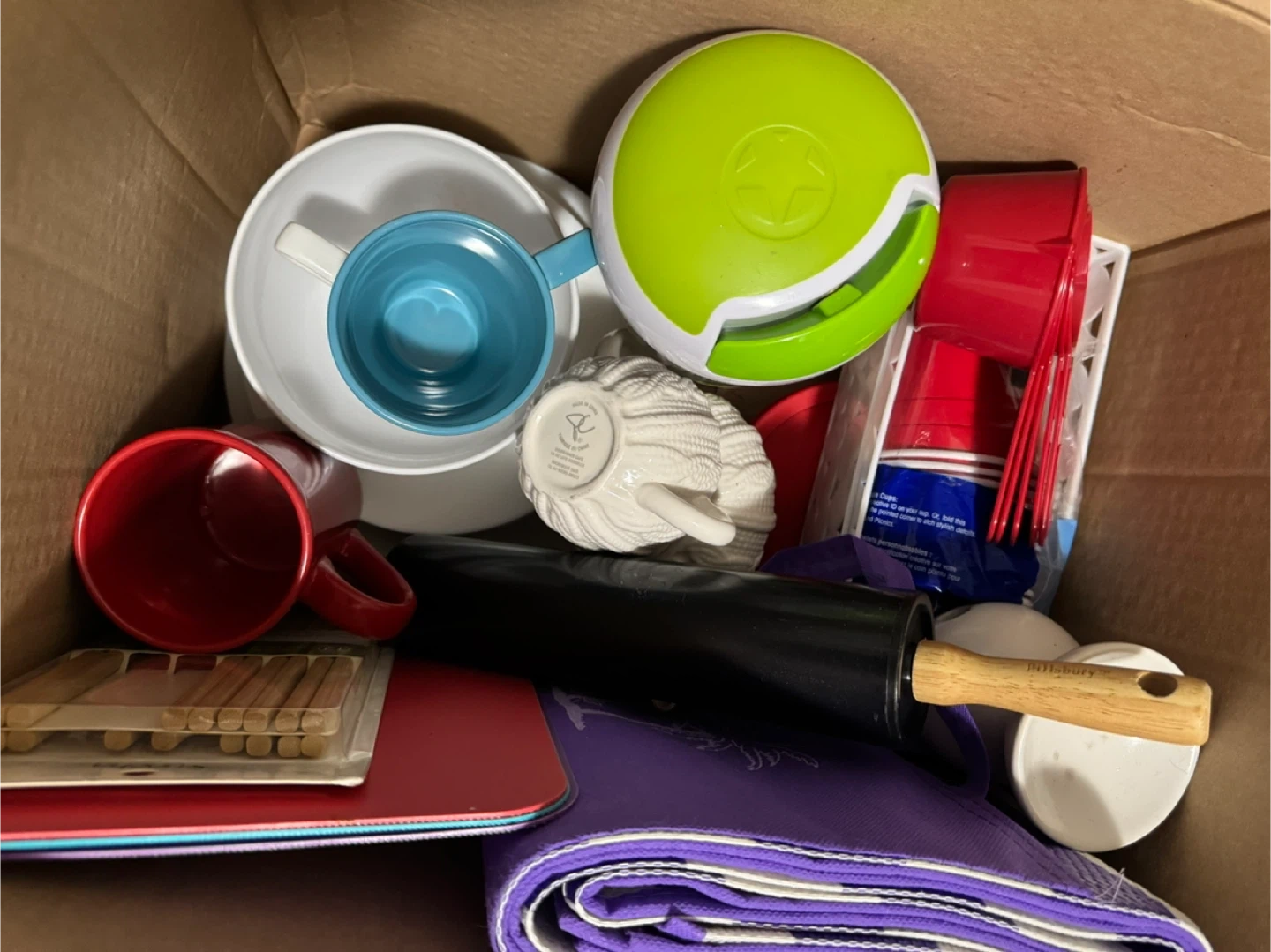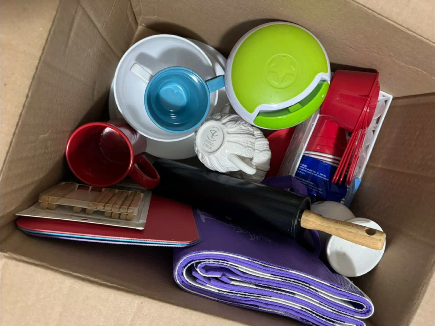 Plates, bowl, mugs for 2, cutting boards, rolling pin, picnic mat, measuring cup