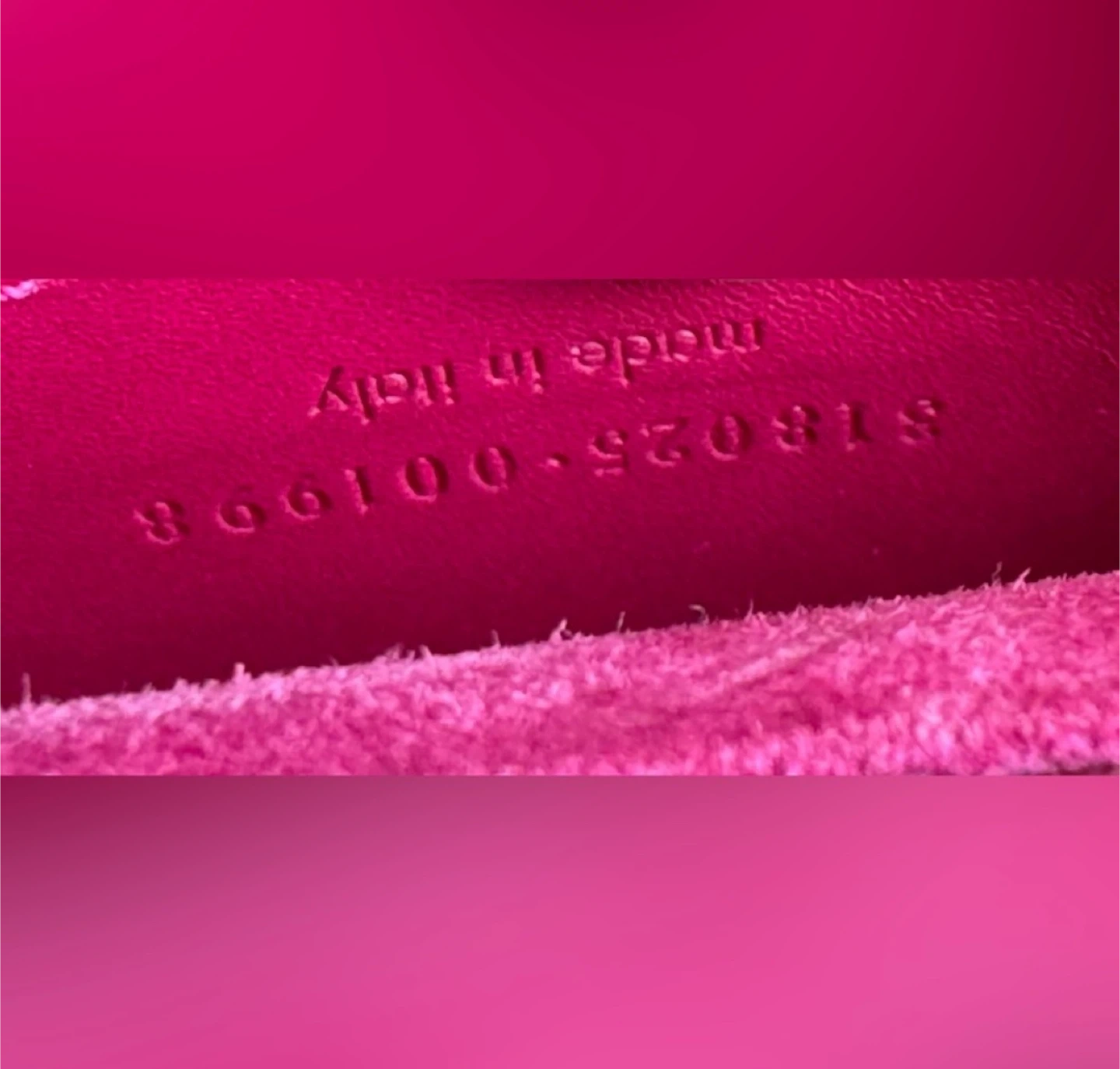 A beautiful Saint Laurent Solferino bag in a striking fuchsia colour! The bag features a gold-tone metal YSL closure, adding a touch of luxury. It's a stylish and compact accessory, perfect for adding a pop of colour to any outfit