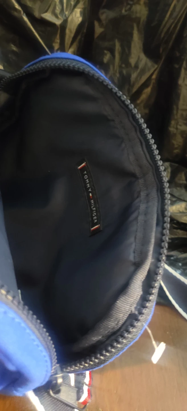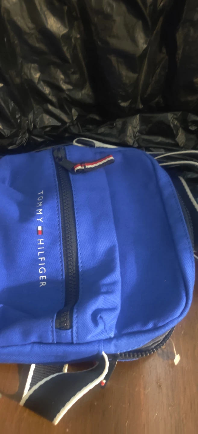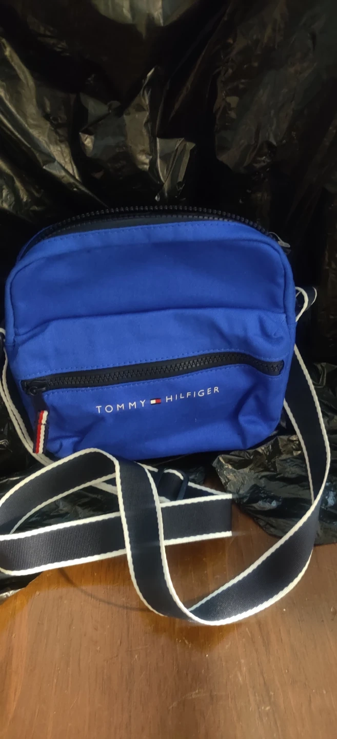This is a blue Tommy Hilfiger crossbody bag. It's made of durable fabric and features a main zippered compartment and a front zippered pocket. Also hace a back picket. The adjustable strap has white and navy trim.New without tags