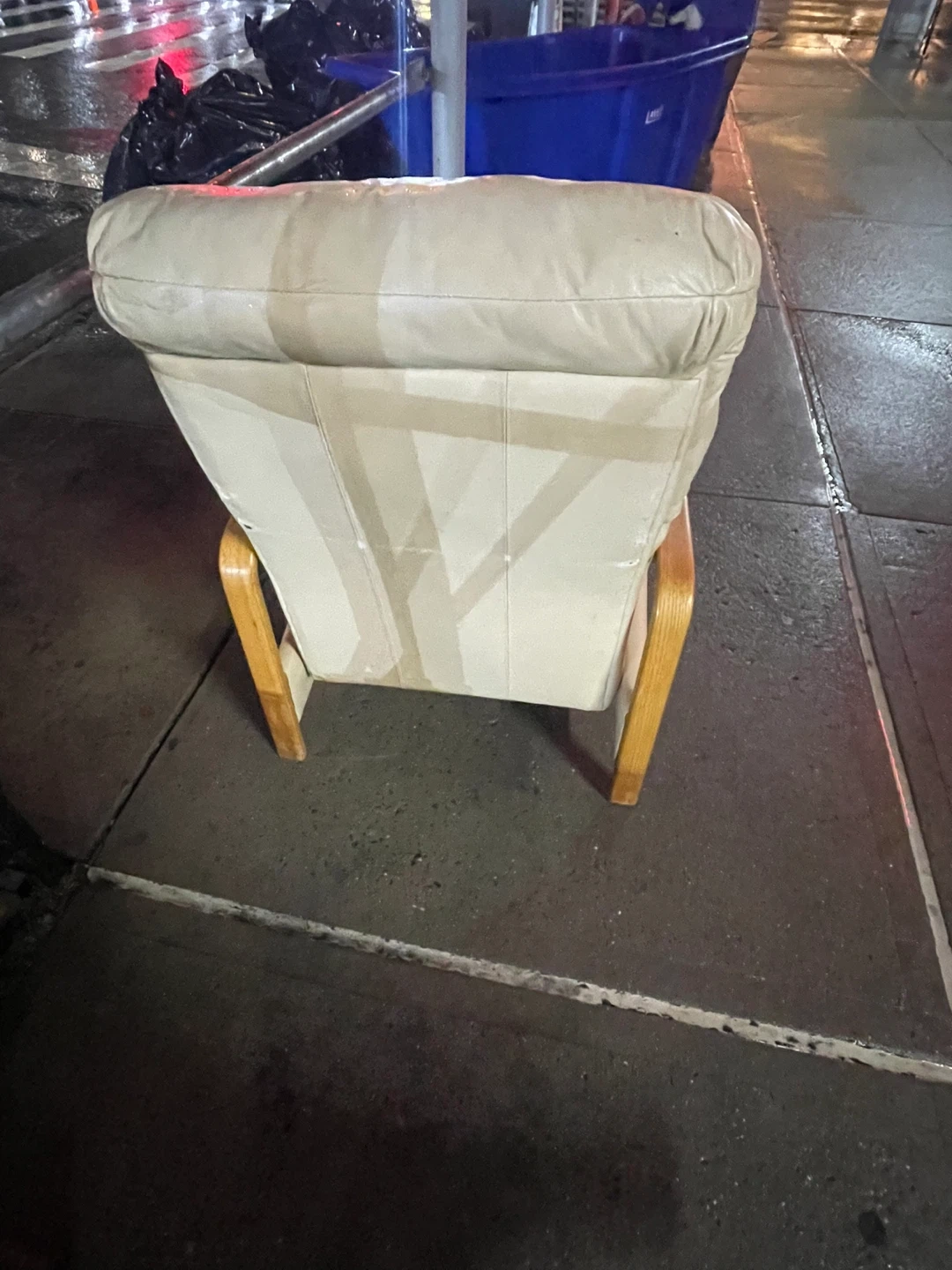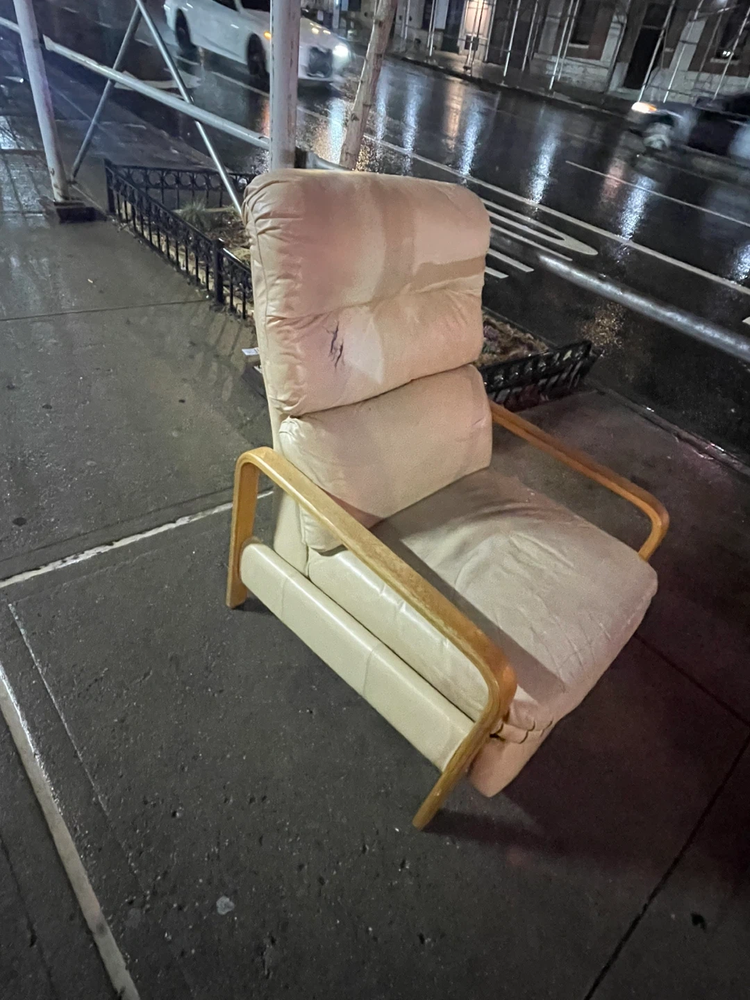 This cream leather armchair features a bentwood frame. It has a padded seat and backrest for comfort. There's a small tear on the backrest.