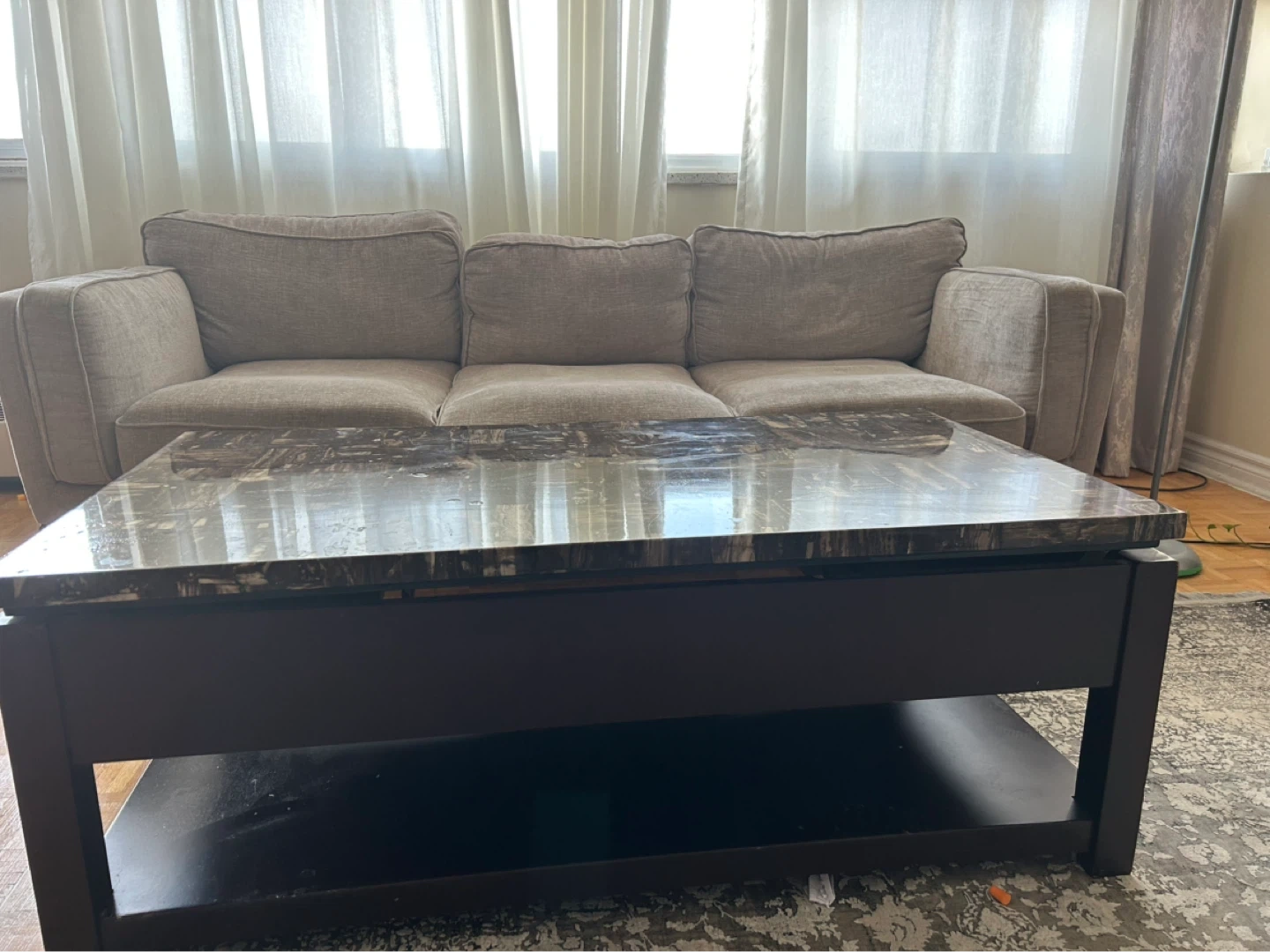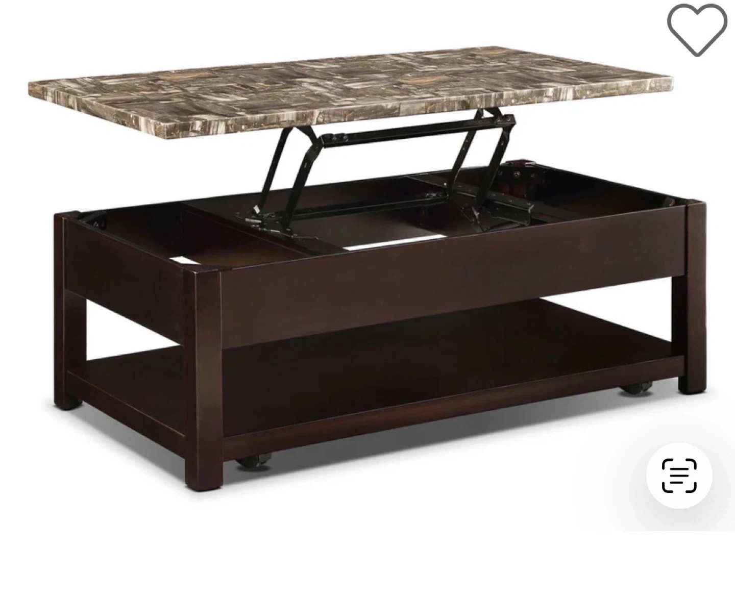 This coffee table features a convenient lift-top design for easy access to storage. The dark wood frame contrasts nicely with the stone-look patterned tabletop. It's perfect for small spaces, offering both a surface for drinks and a hidden compartment for your essentials.