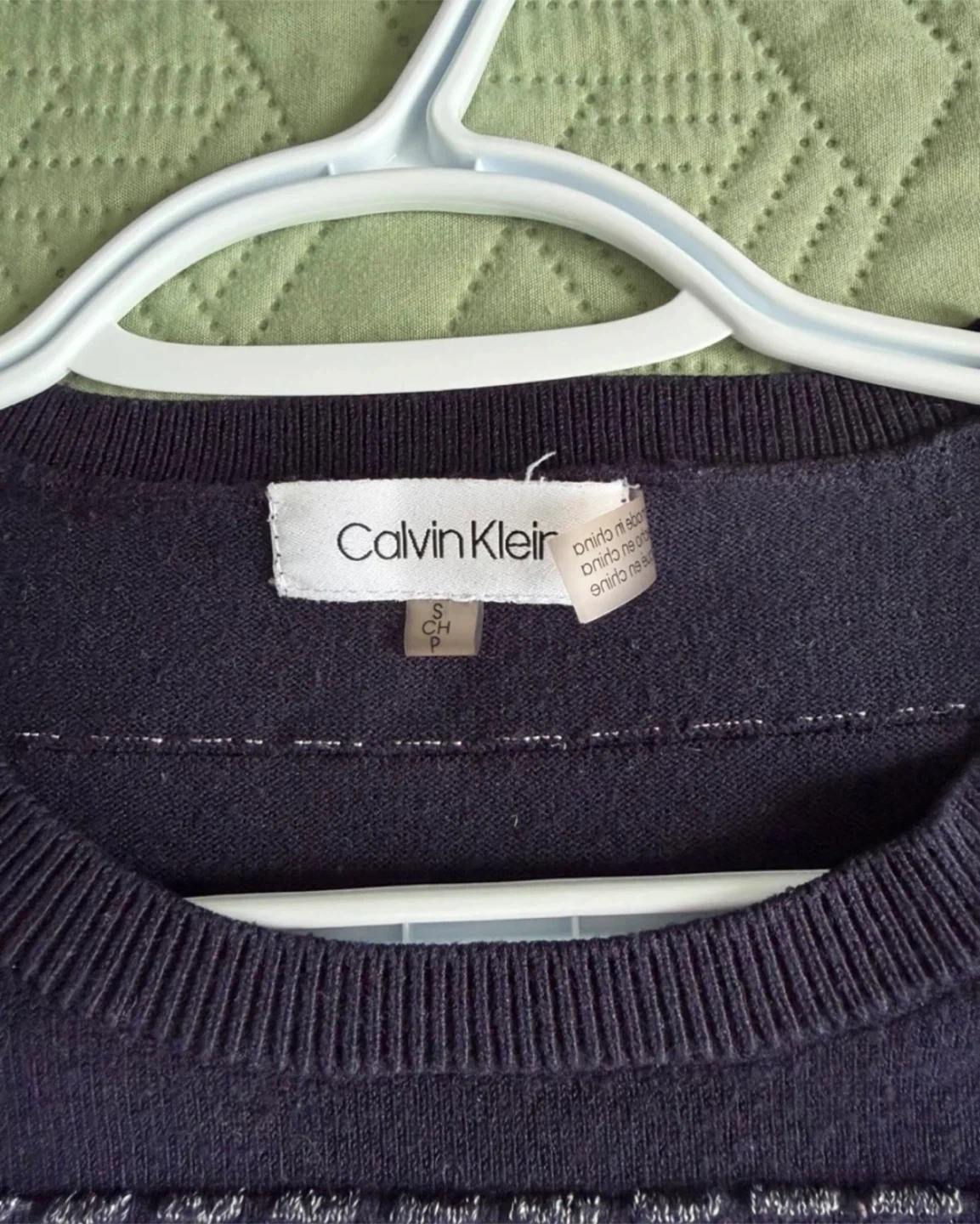 Navy long-sleeved sweater by Calvin Klein. Features a striped pattern with subtle contrast stitching. Made of a soft knit material. Size is small.