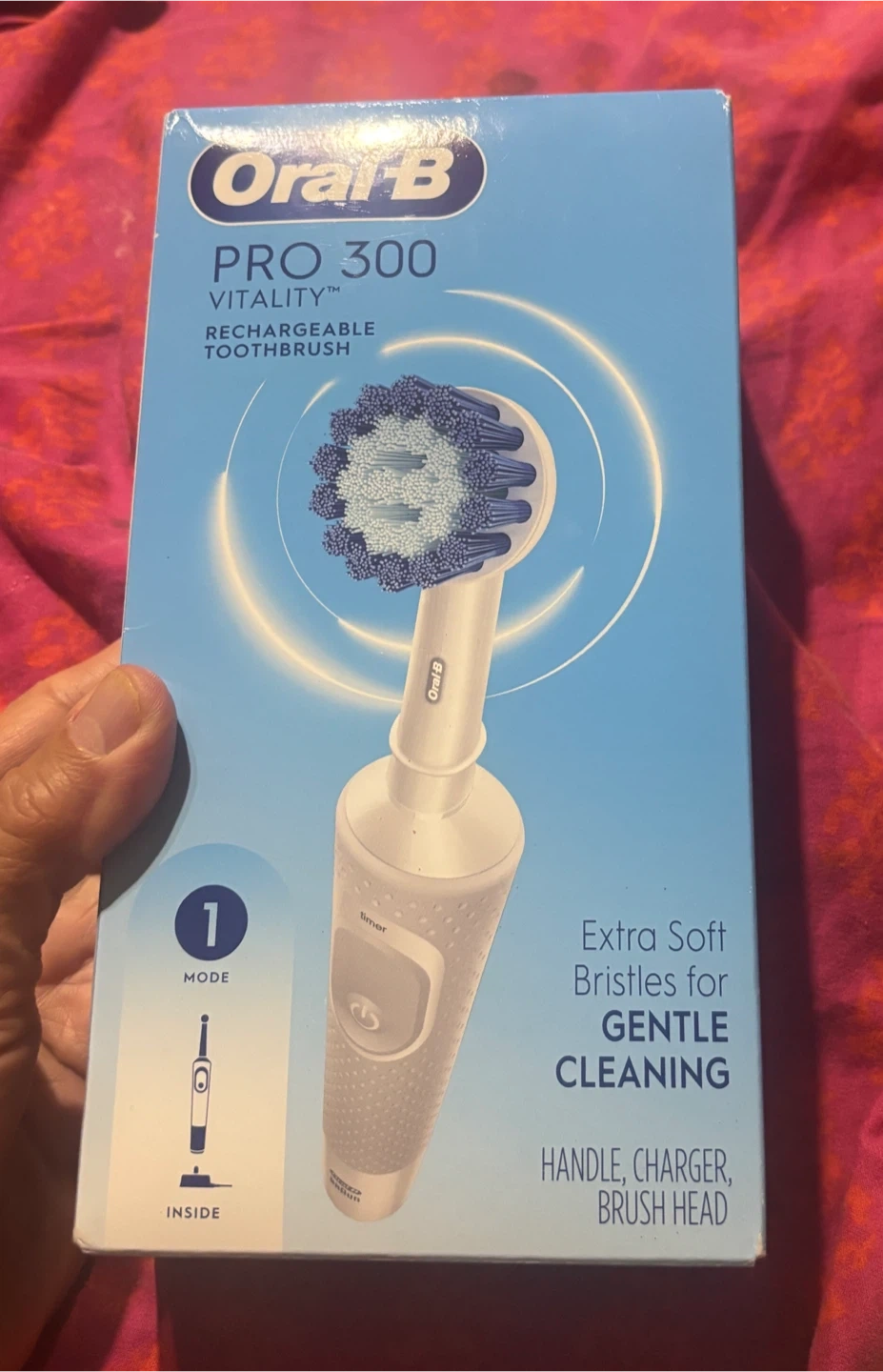 I'm selling an Oral-B Pro 300 Vitality rechargeable toothbrush. It comes with extra soft bristles for gentle cleaning. Includes the handle, charger, and brush head. It is BRAND NEW in box!