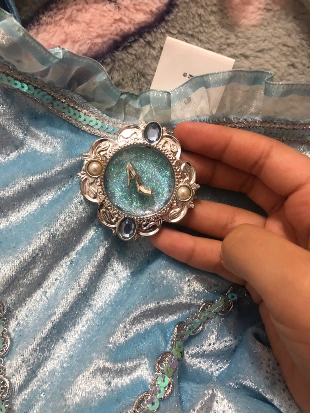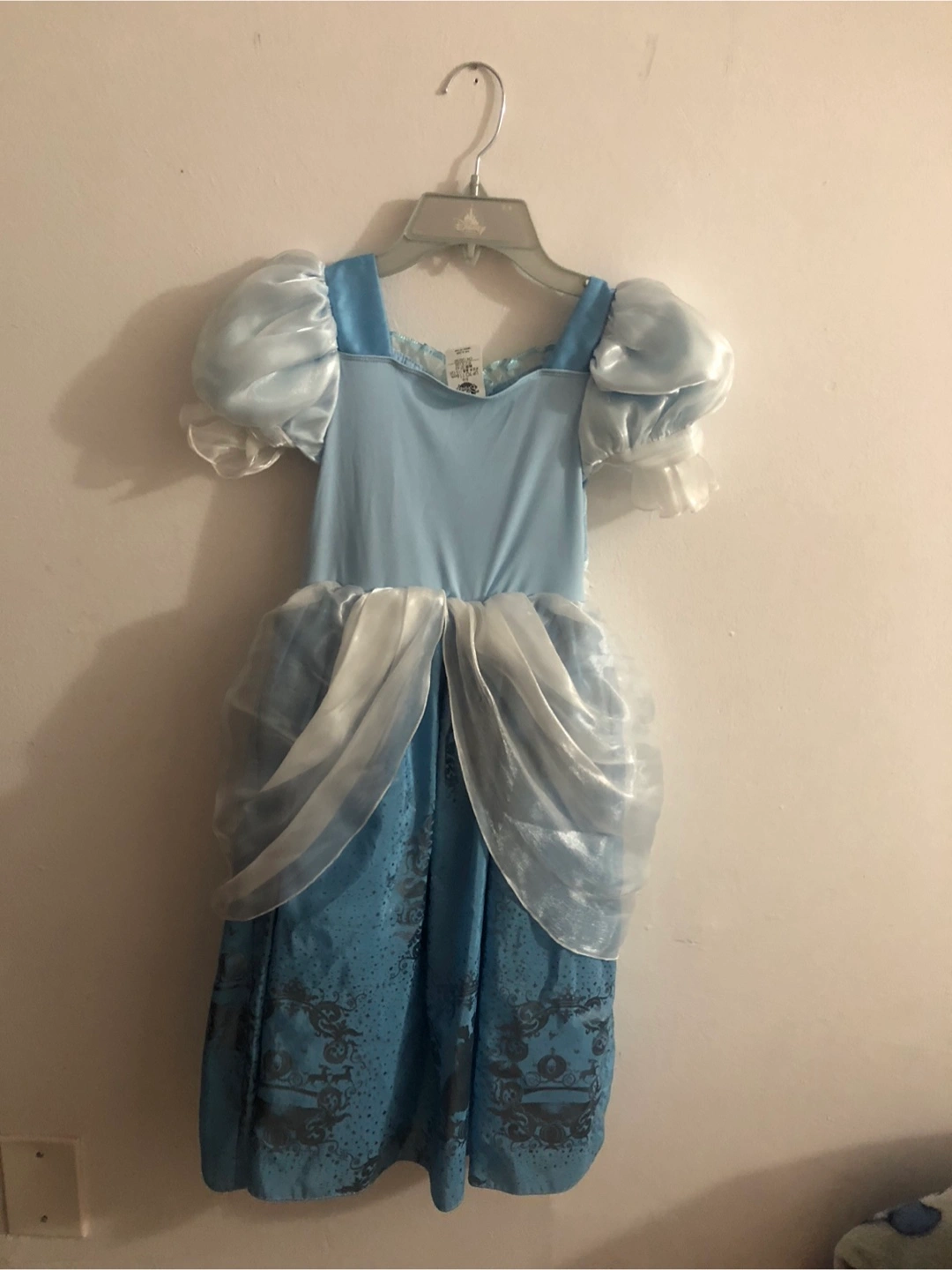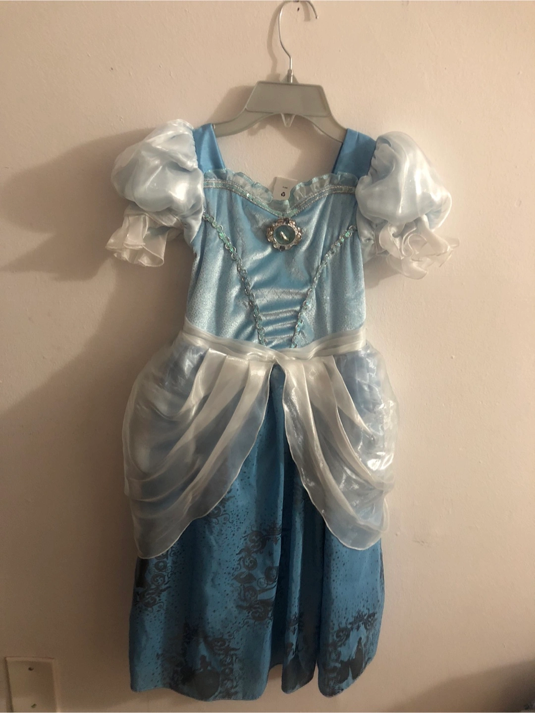 Beautiful Cinderella costume dress. Light blue with sheer overlay. Features puff sleeves, and a glass slipper brooch. Size 5/6. Made in China.