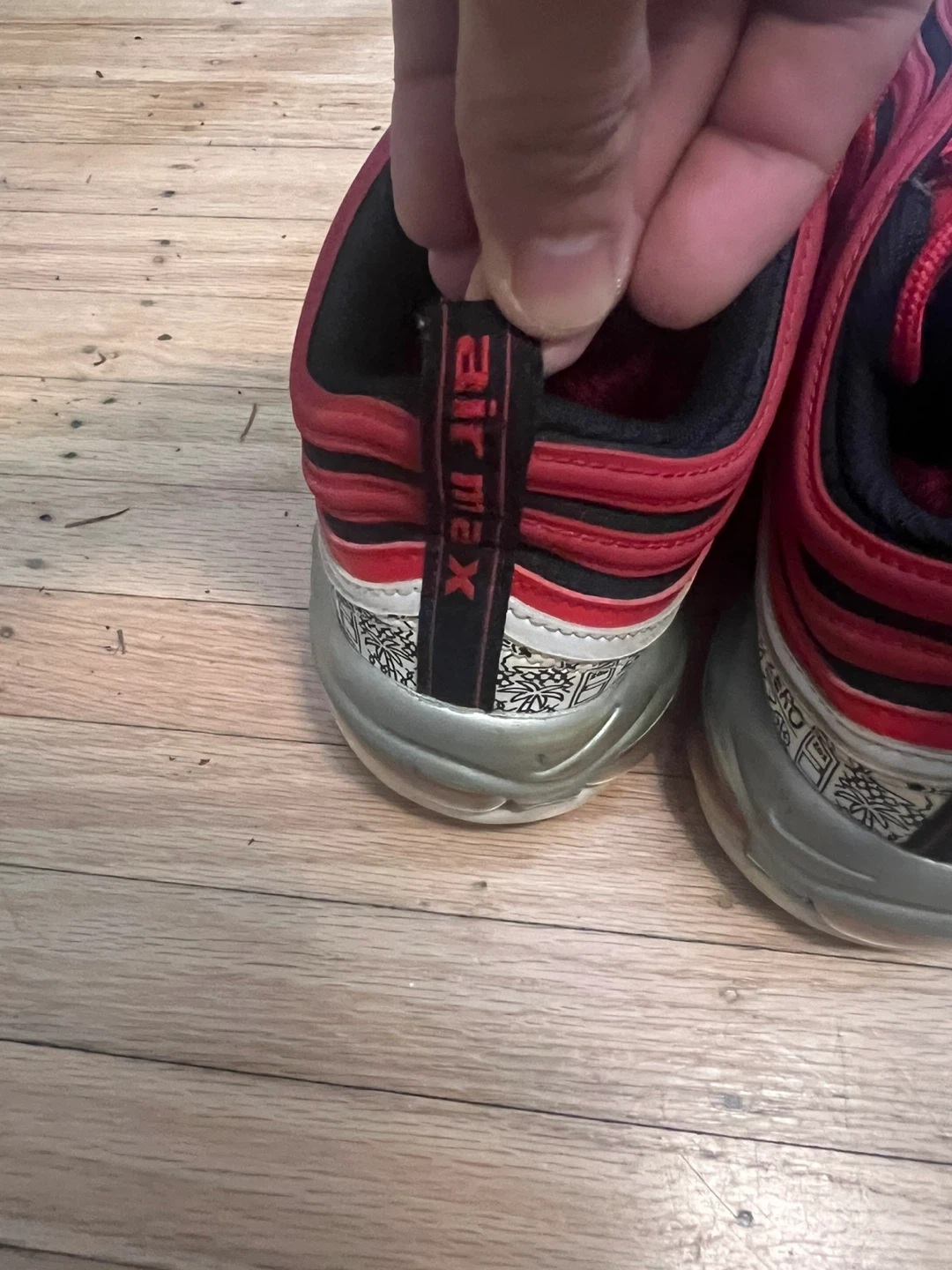 These are Nike Air Max 97 sneakers in a red and black colourway. They feature the iconic Air Max cushioning. They're a stylish pair for everyday wear.