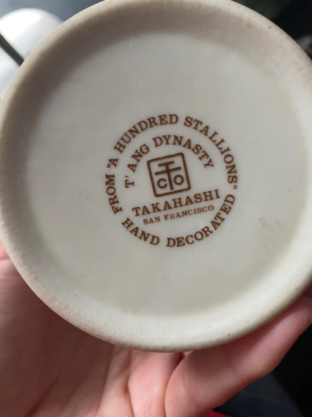 Rare vintage MCM mugs from Takahashi San Francisco (1950-1980s)! It features a unique 'A Hundred Stallions' design inspired by the T'ang Dynasty. It's hand-decorated and in perfect condition AND STAMP on bottom for proof of authenticity.