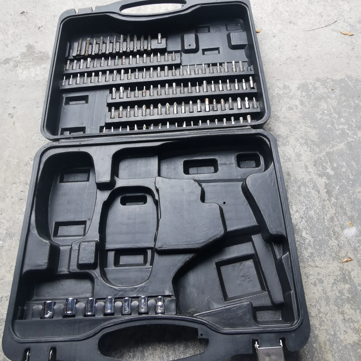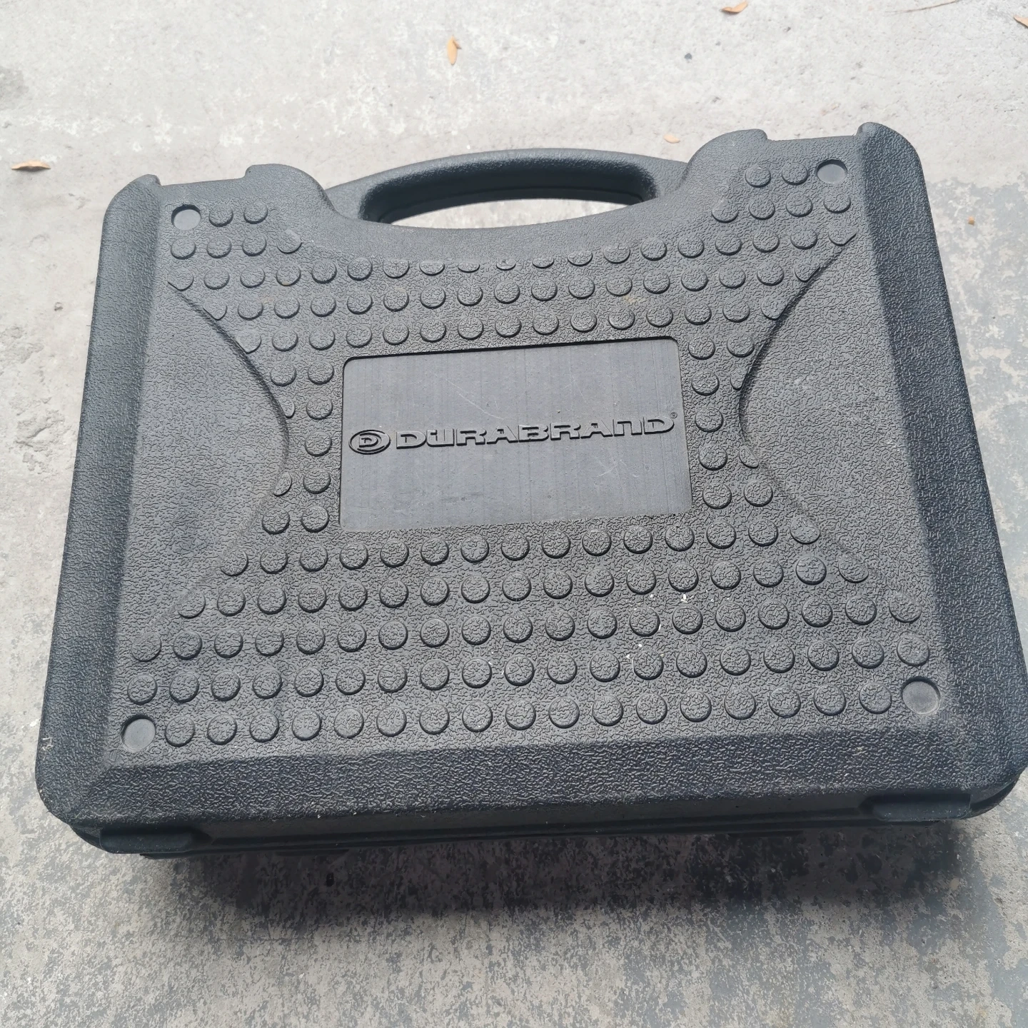 This is a Durabrand tool kit case. It's black and includes a variety of bits and sockets. The case has a textured exterior and a handle for easy transport. It's great for keeping your tools organized.