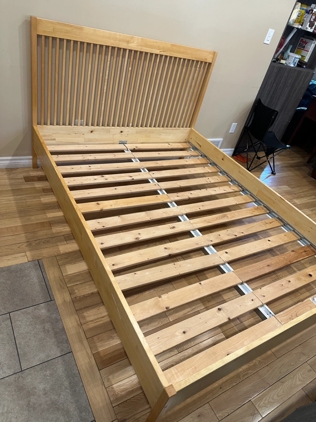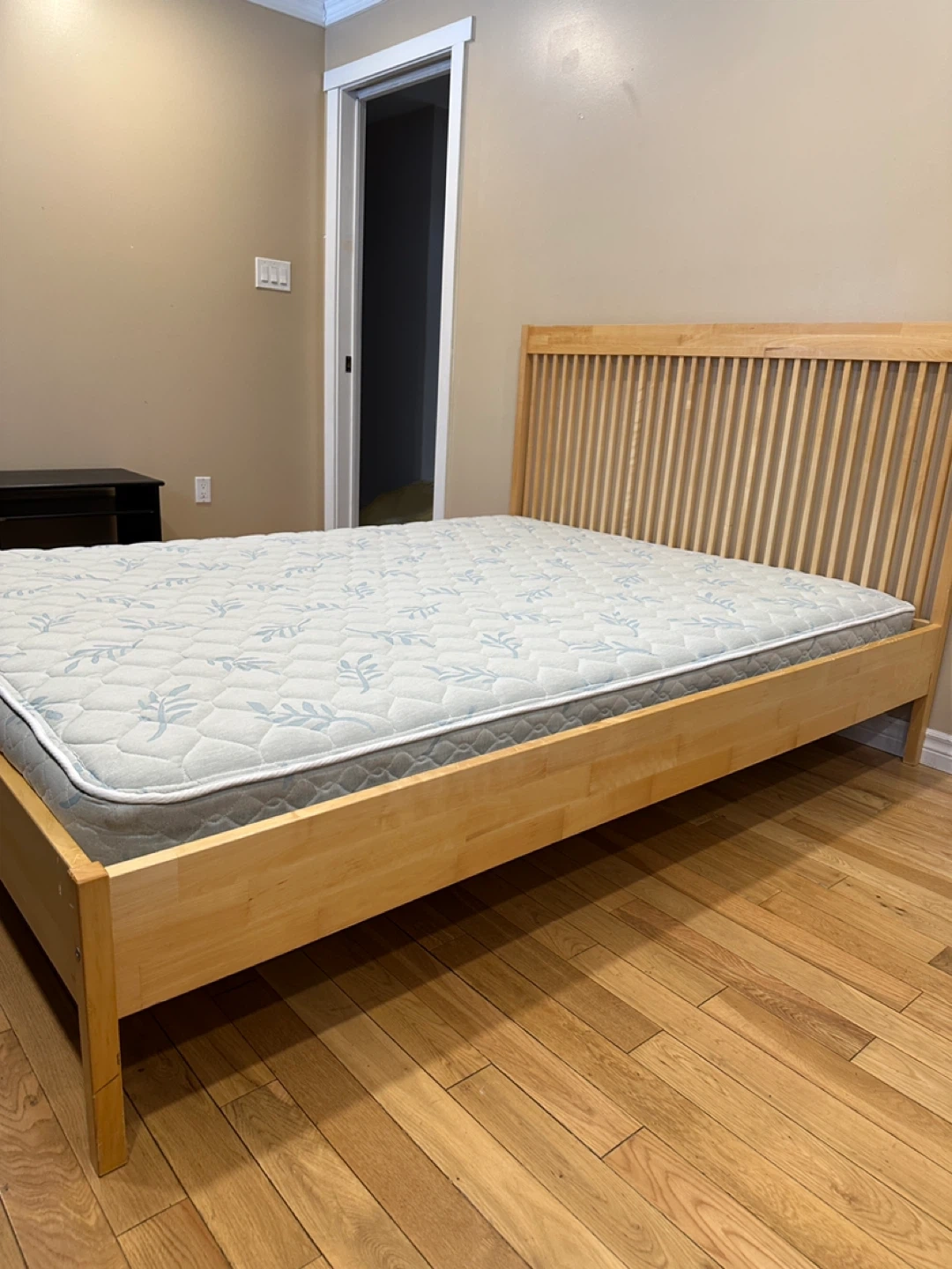 IKEA queen bed frame in a natural birch finish with a clean Scandinavian design. Sturdy frame with a slatted headboard and wooden mattress support.