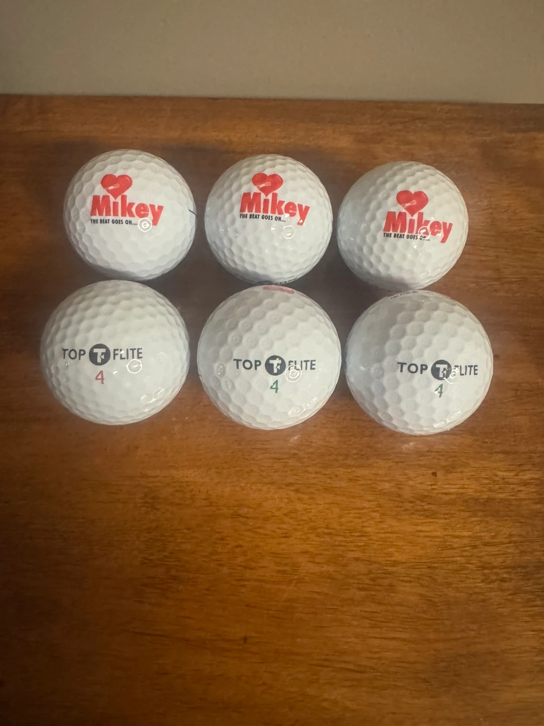 Set of six white Top Flite golf balls. All balls have the "Mikey The Beat Goes On" logo from the Mikey Network charity. These are standard golf balls.