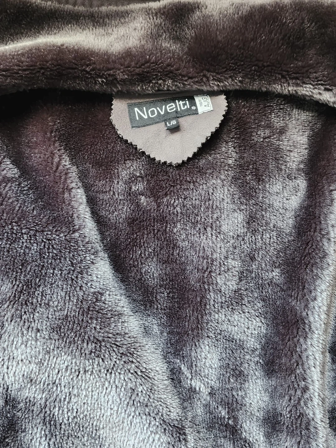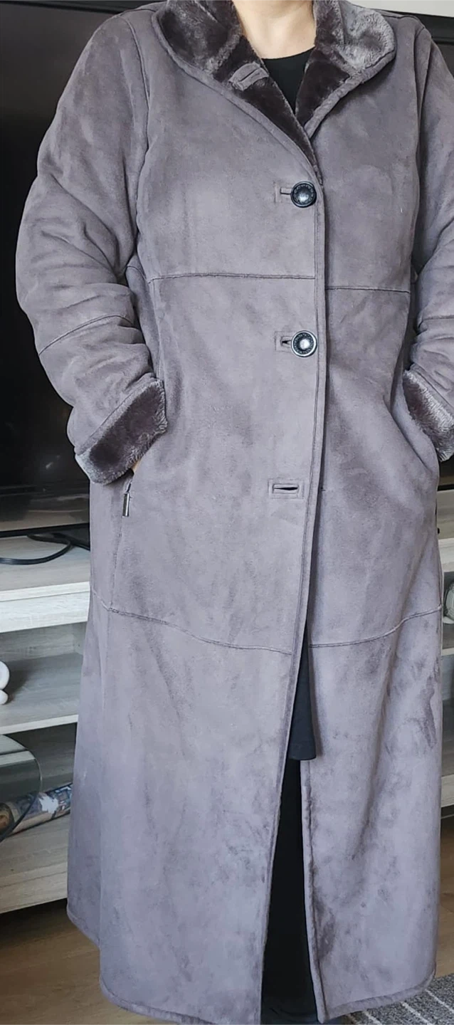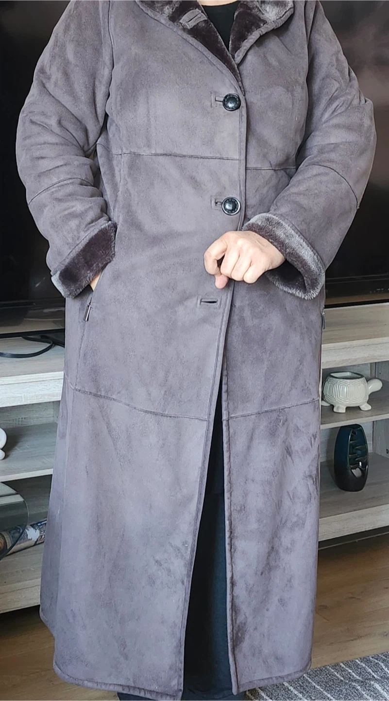 This is a Novelty brand maxi coat in a grey colour. It features a soft, suede-like exterior and a faux fur lining for warmth. The coat has a button-up front and a comfortable L/G size. It's a stylish option for cooler weather!