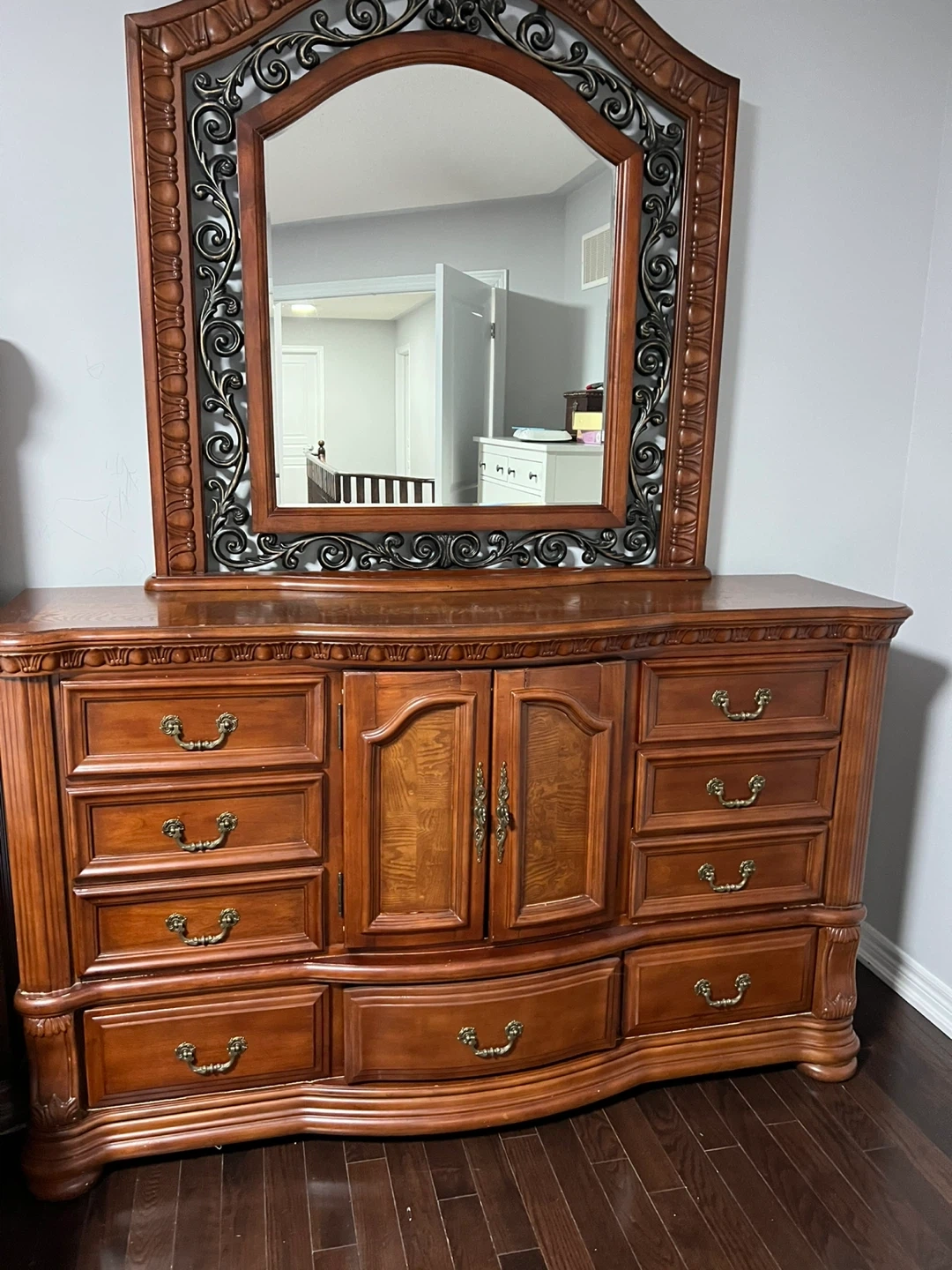 This is a beautiful solid wood dresser with an ornate mirror. It features a rich wood finish and detailed carvings. The dresser has multiple drawers and a central cabinet for ample storage. It's a sturdy and elegant piece for any bedroom. This dresser would be useful for organizing clothing and accessories.