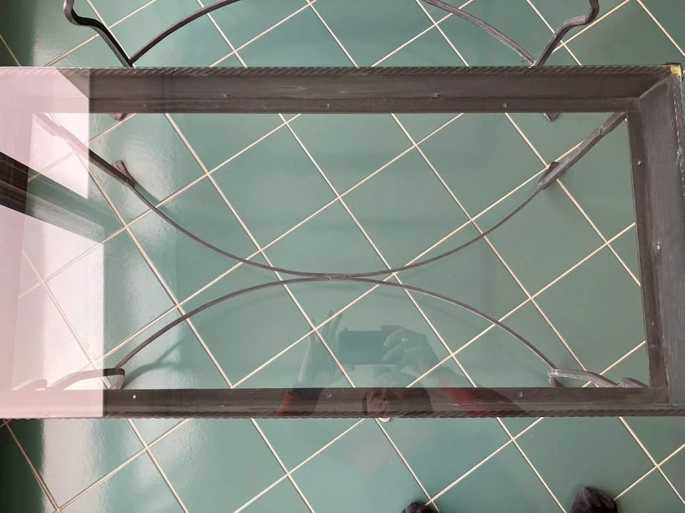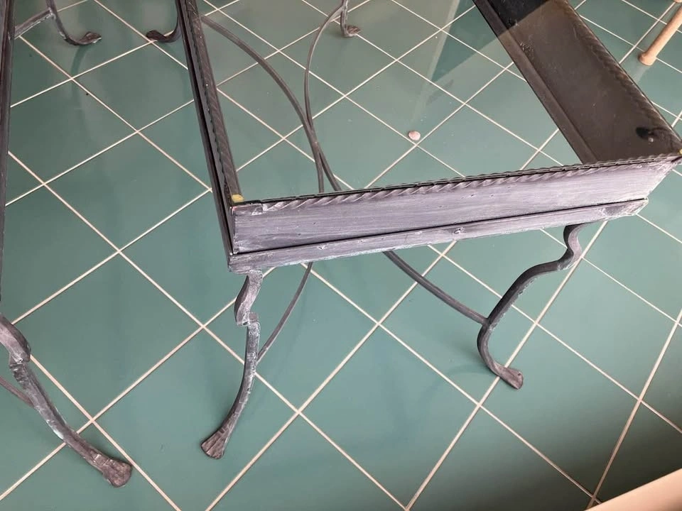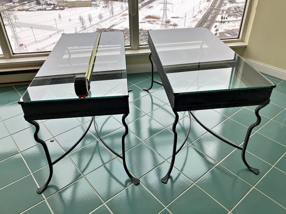 Stylish pair of glass top tables. Black metal bases with cool curved legs. Glass tops are clear. Tables measure about 35.5 inches long and 17 inches wide. Good for living room or as side tables.
