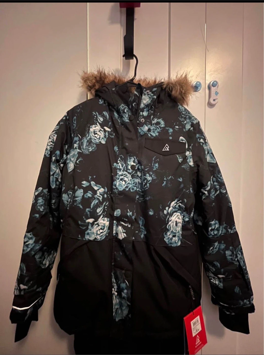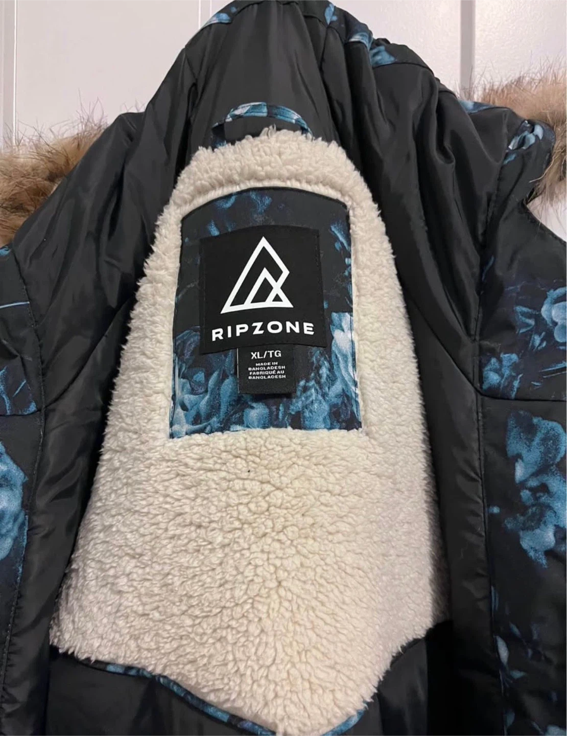 This Ripzone girls ski jacket is a size XL = women size S-M, and features a blue floral pattern. It's designed for cold weather activities. It has a sherpa-lined interior for warmth. Made in Canada.