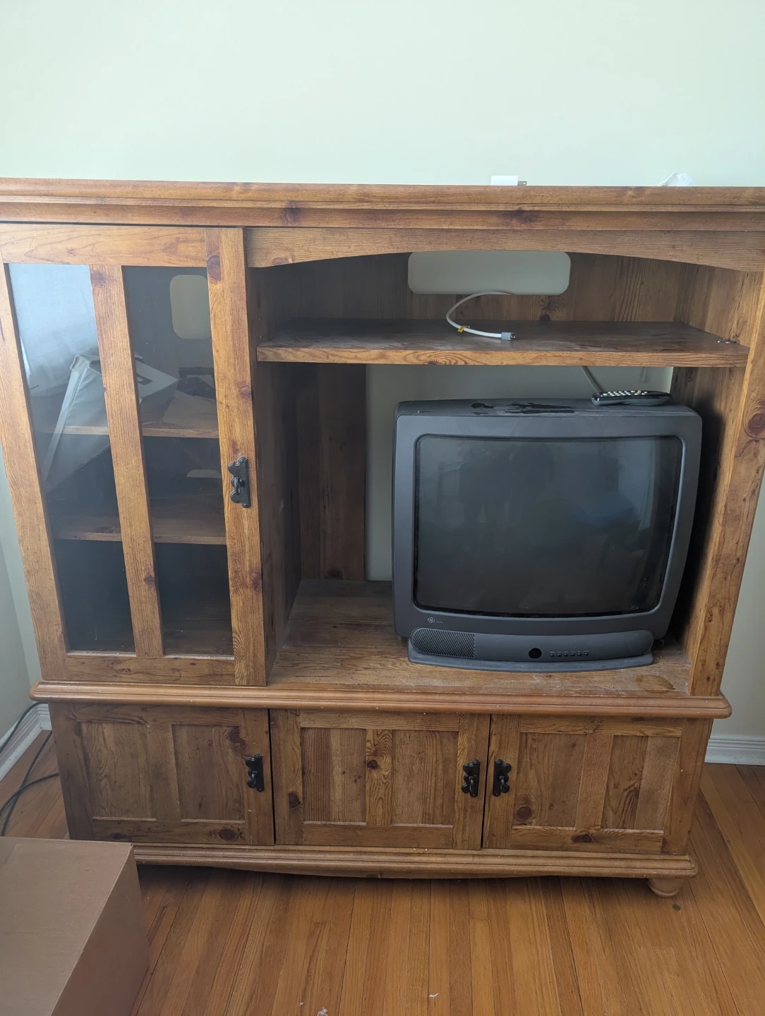 PICK UP .. A solid wood (oak) entertainment unit with a glass-door cabinet and lower storage cupboards. It's perfect for organizing media consoles and other electronics. The unit features a rustic wood finish.