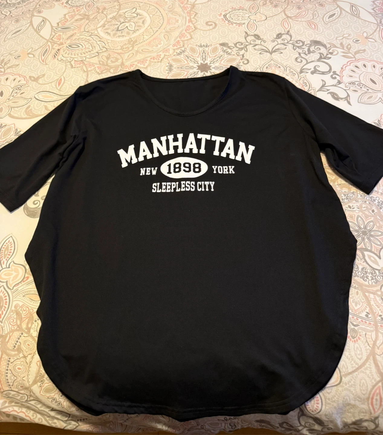 black t-shirt from Dazy features a "Manhattan 1898 Sleepless City" graphic print. It's a size Large with a slit curved hem. Very stretchy and comfortable. Barely worn and in perfect condition.