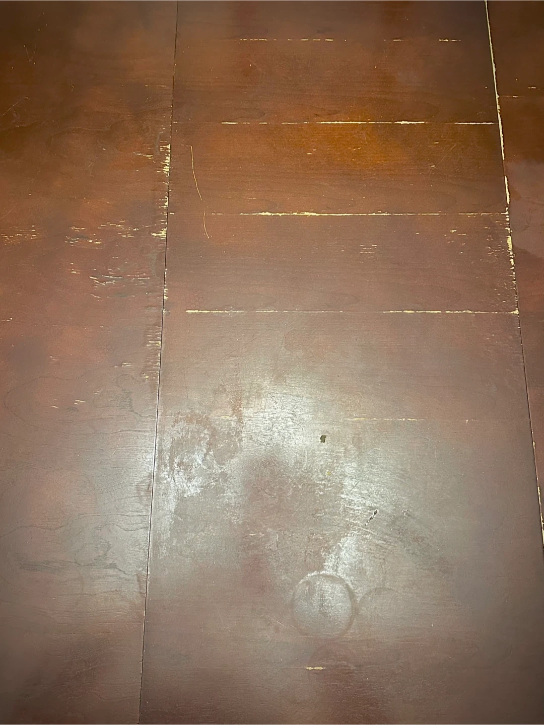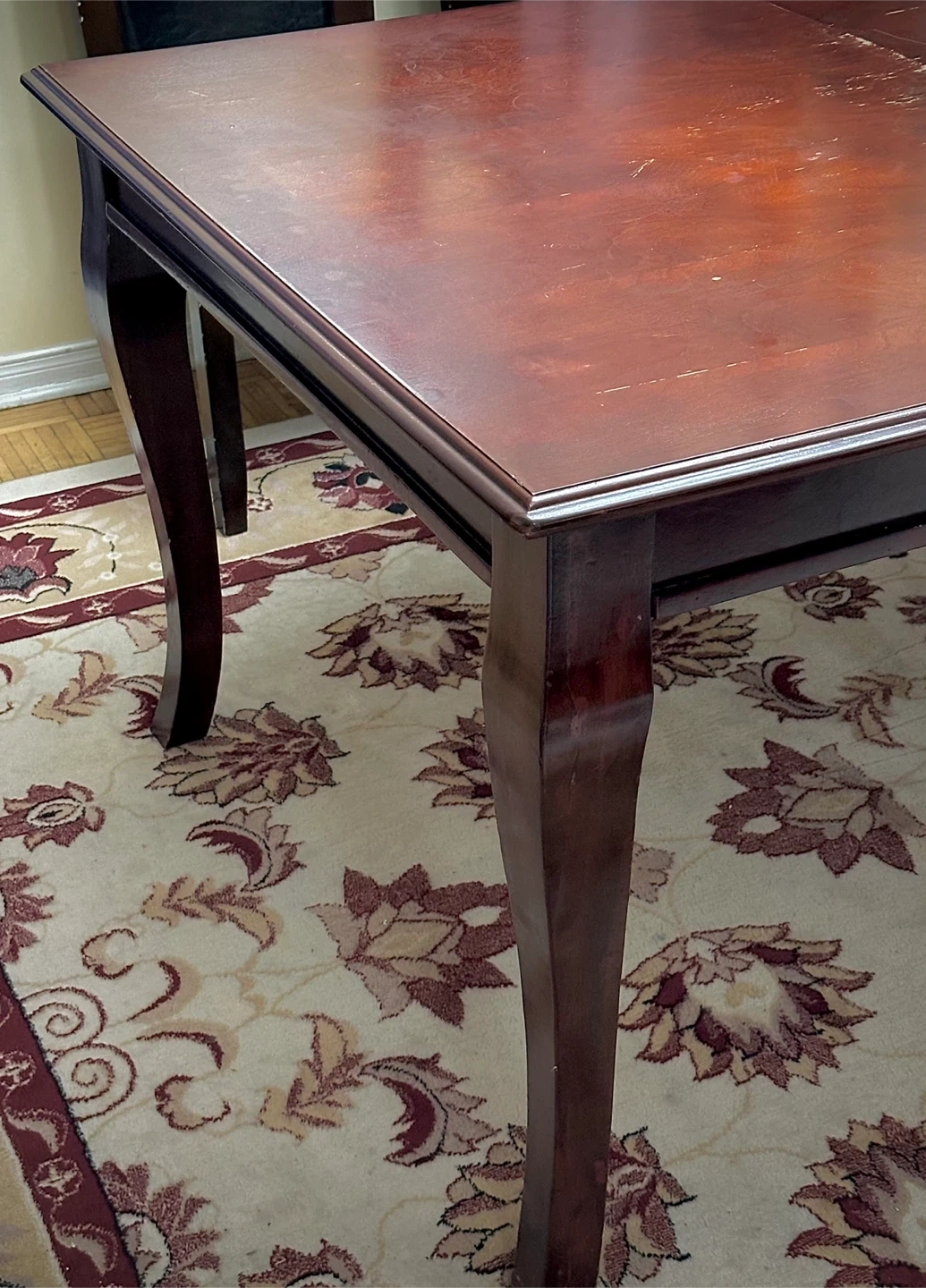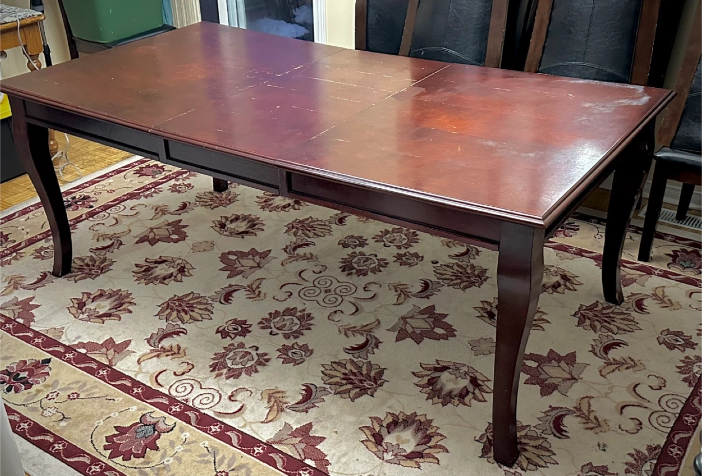 Selling a wooden dining table. It's in used condition with some visible wear and tear on the surface, as shown in the photos. Still a sturdy piece of furniture and you can cover it with a table cloth! It is extendable to 78” length with an 18” centre leaf.