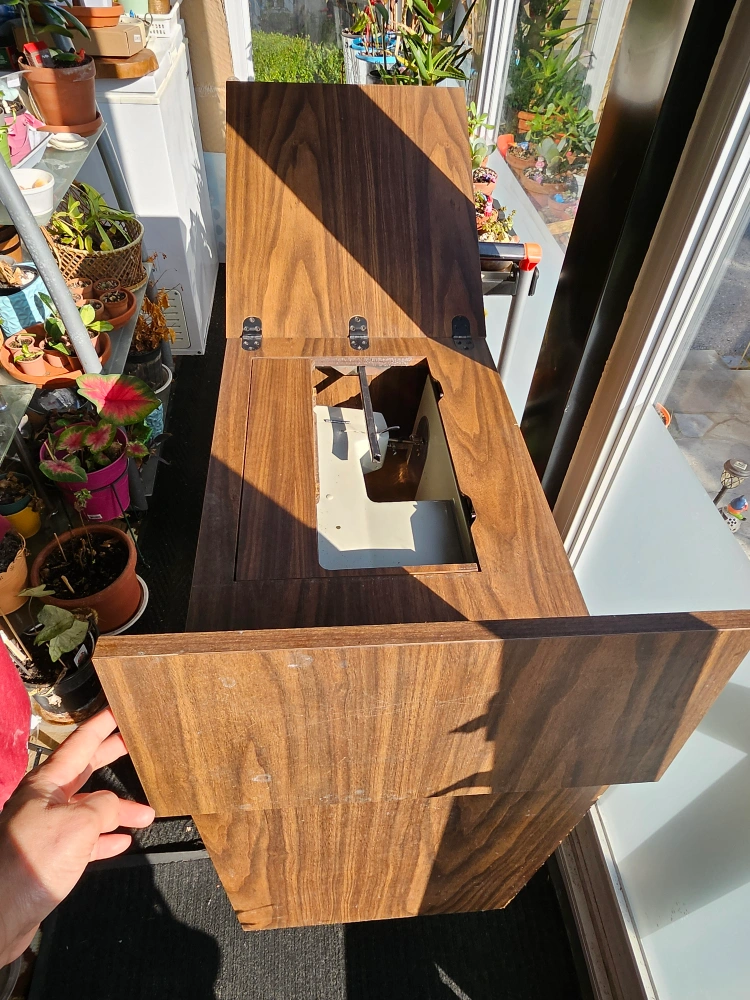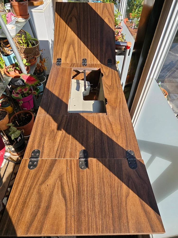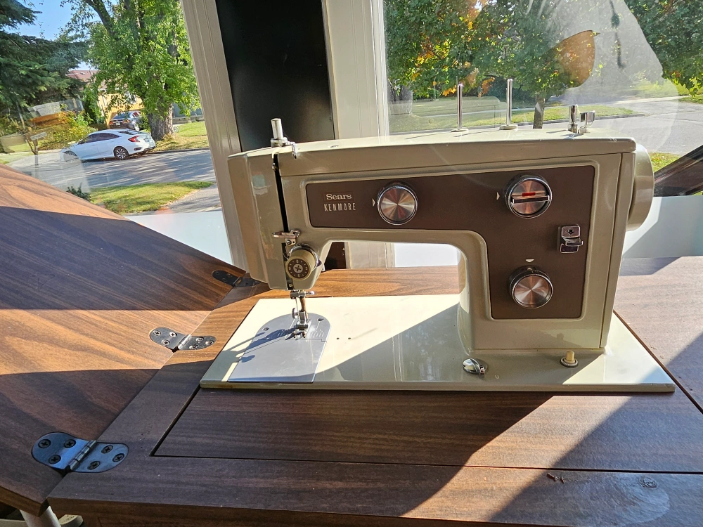 Vintage Sears Kenmore sewing machine with folding table. The table has hinges that fold down so the machine is easily stored. The sewing machine includes a foot pedal. This vintage sewing machine is working properly and it's been in the storage room for very long time. It needs to run first in several times in order to get the smoothness and better run. The cabinet has a cheaped on the left side as it shown in the couple of pictures at the end.