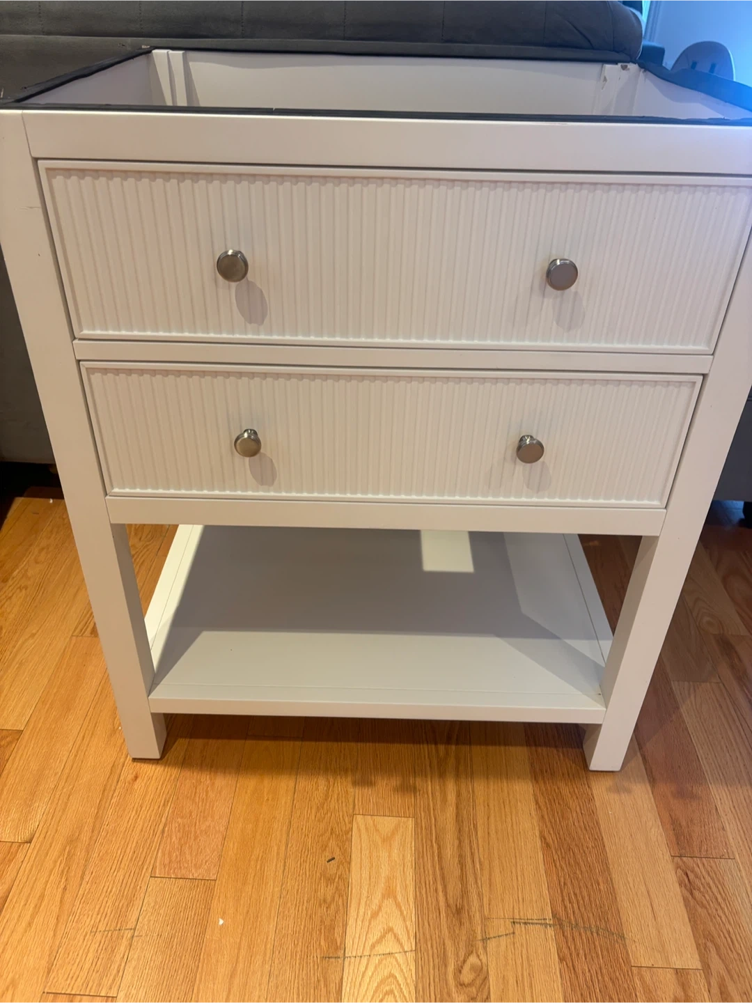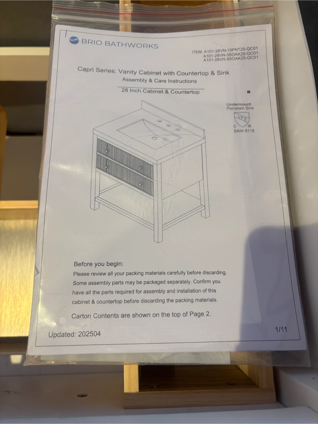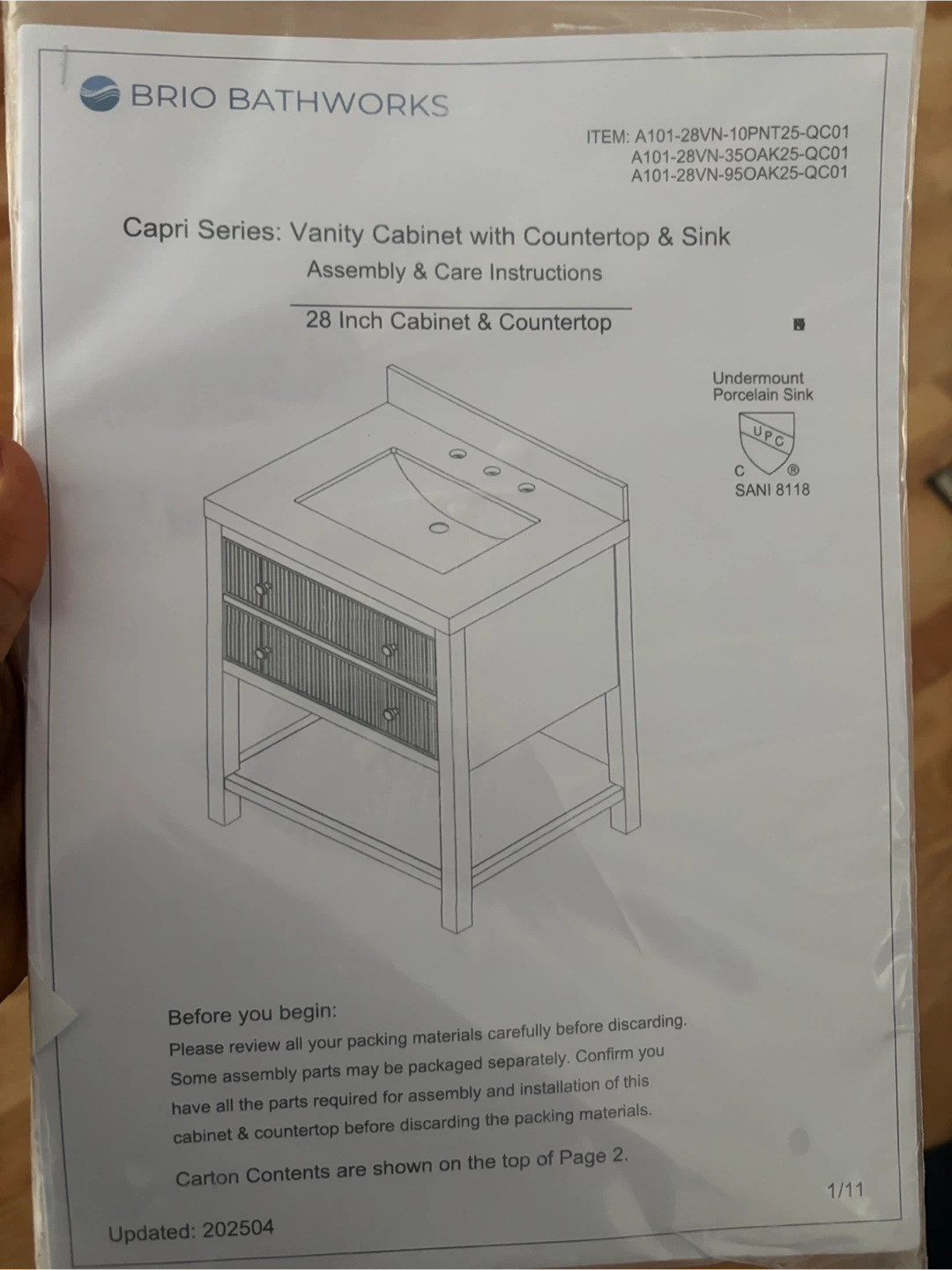 Brio Bathworks Capri Series vanity cabinet. It's a 28-inch cabinet with a countertop and sink. Features two drawers with internal organizers and an open shelf below. This cabinet would be useful for bathroom storage.it doesn’t include the SINK