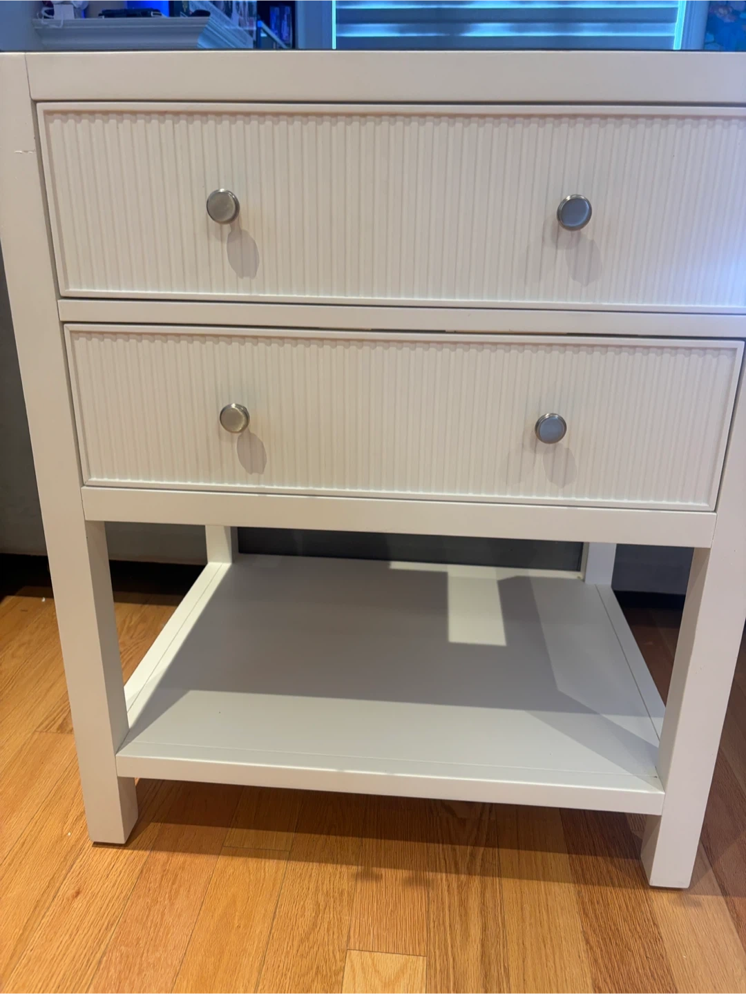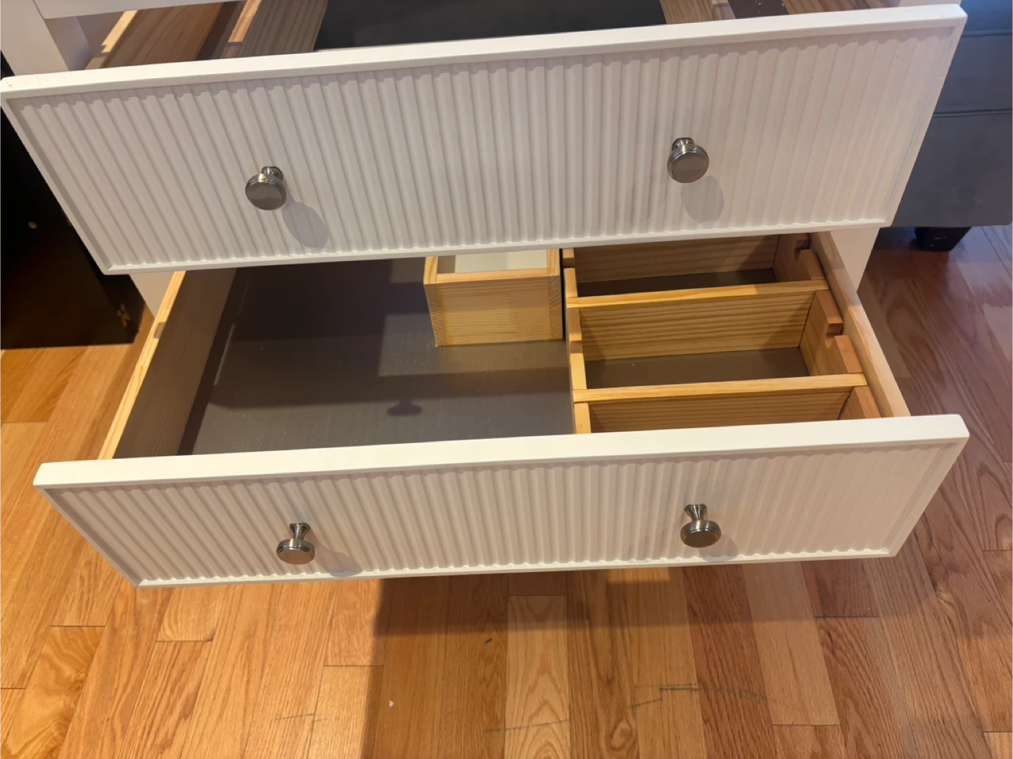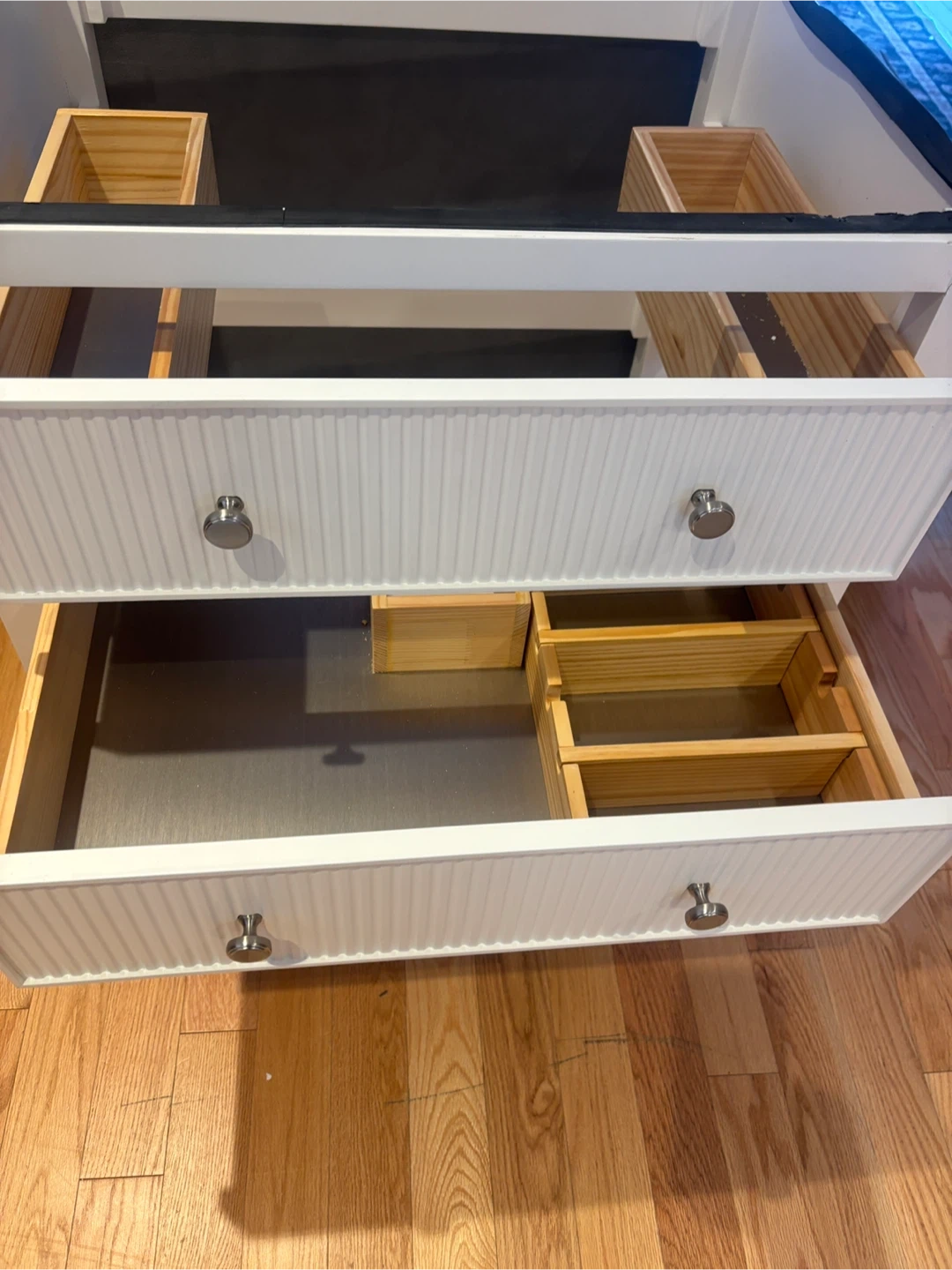 Brio Bathworks Capri Series vanity cabinet. It's a 28-inch cabinet with a countertop and sink. Features two drawers with internal organizers and an open shelf below. This cabinet would be useful for bathroom storage.it doesn’t include the SINK