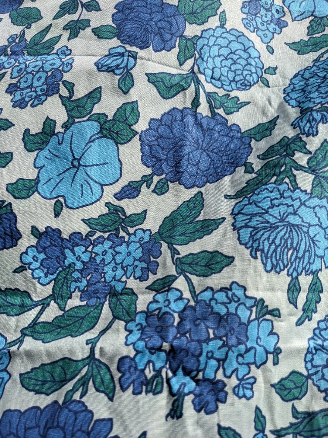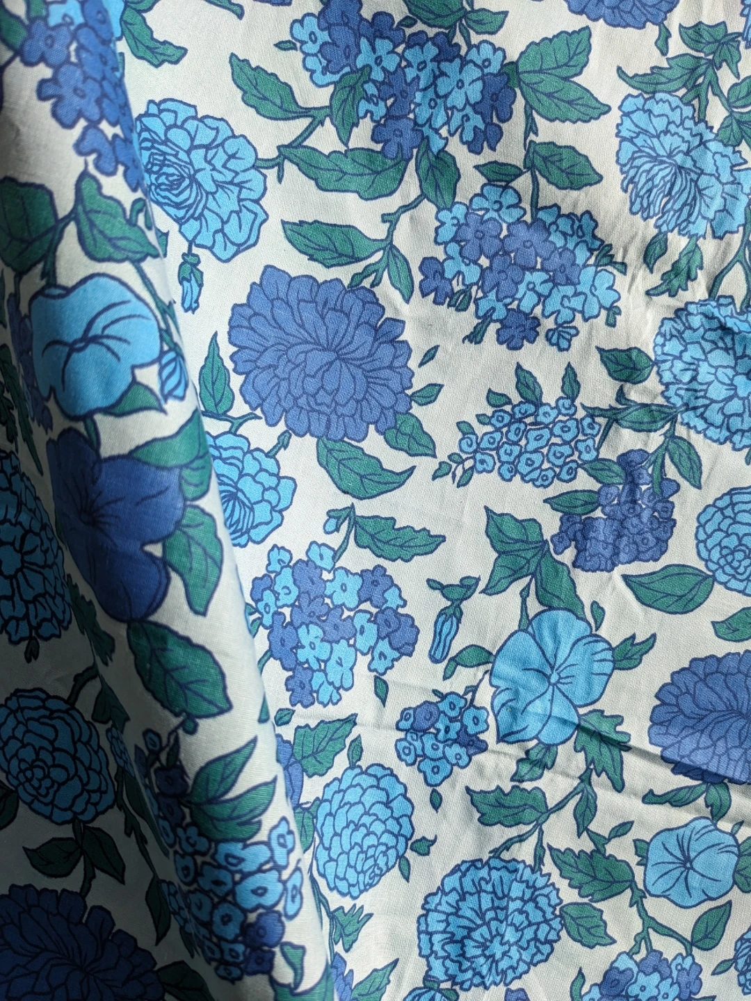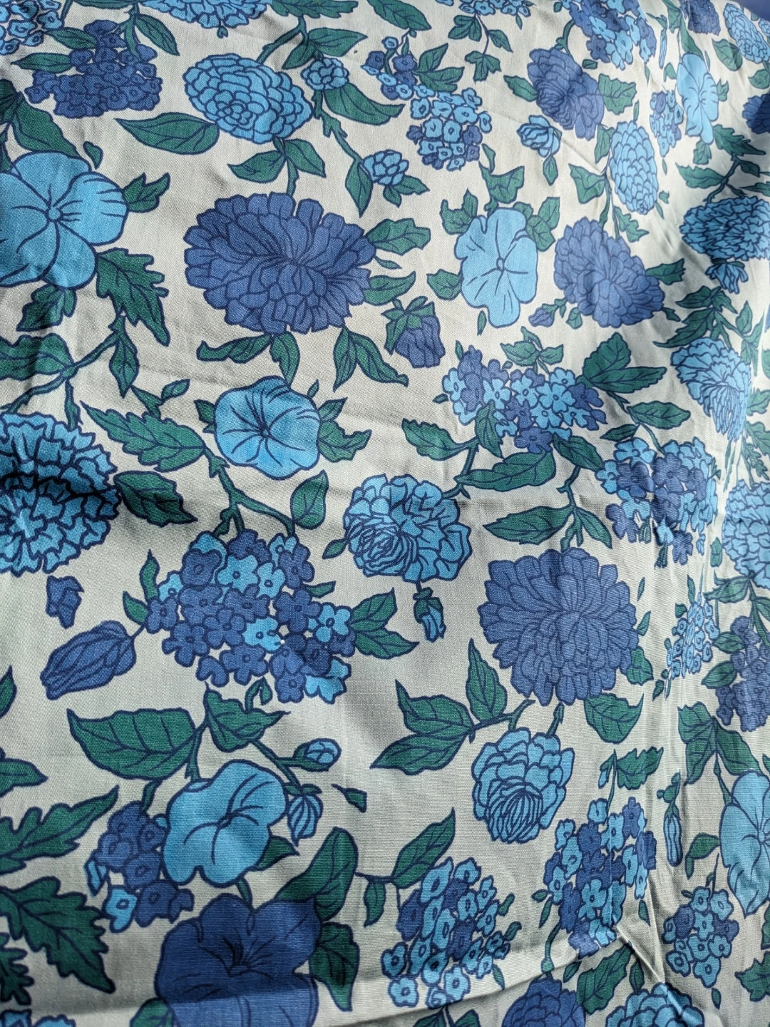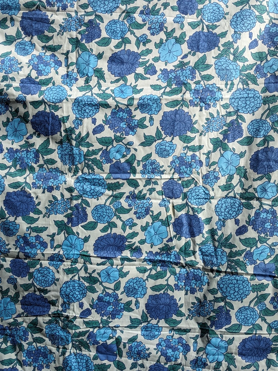 This is a fabric with a blue floral pattern. It features various shades of blue flowers and green leaves on a light background. The material appears to be cotton or a cotton blend.