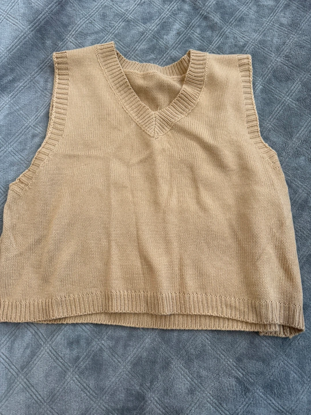 A cozy cropped beige sleeveless knit vest with a classic V-neck design. Had it for a while and never wore so I'm selling it. Size XL