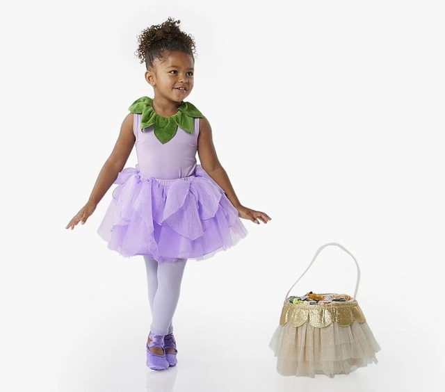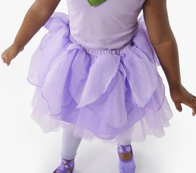Tiny tots can transform into blooming flowers with this sweet Halloween costume. It's made from ultra-comfy fabric with petal-perfect details like green appliqué leaves at the neck and airy organza on the skirt. This is a 2-piece set including a top and a tutu. The separates make changing easier. Super soft fabrics are cozy and comfy on the skin, with soft elastic waistbands and trims that are great for sensitive skin. The top is 95% polyester, 5% spandex knitted jersey fabric with green velour leaves around the neck and a snap tape opening on the backside. The tutu is made of 71% polyester, 29% nylon organza petals and 100% polyester mesh layers, with a 100% polyester satin lining and an elastic waistband. Slippers are 95% polyester, 5% spandex with 100% lining. The costume is yarn-dyed for vibrant, lasting colors.