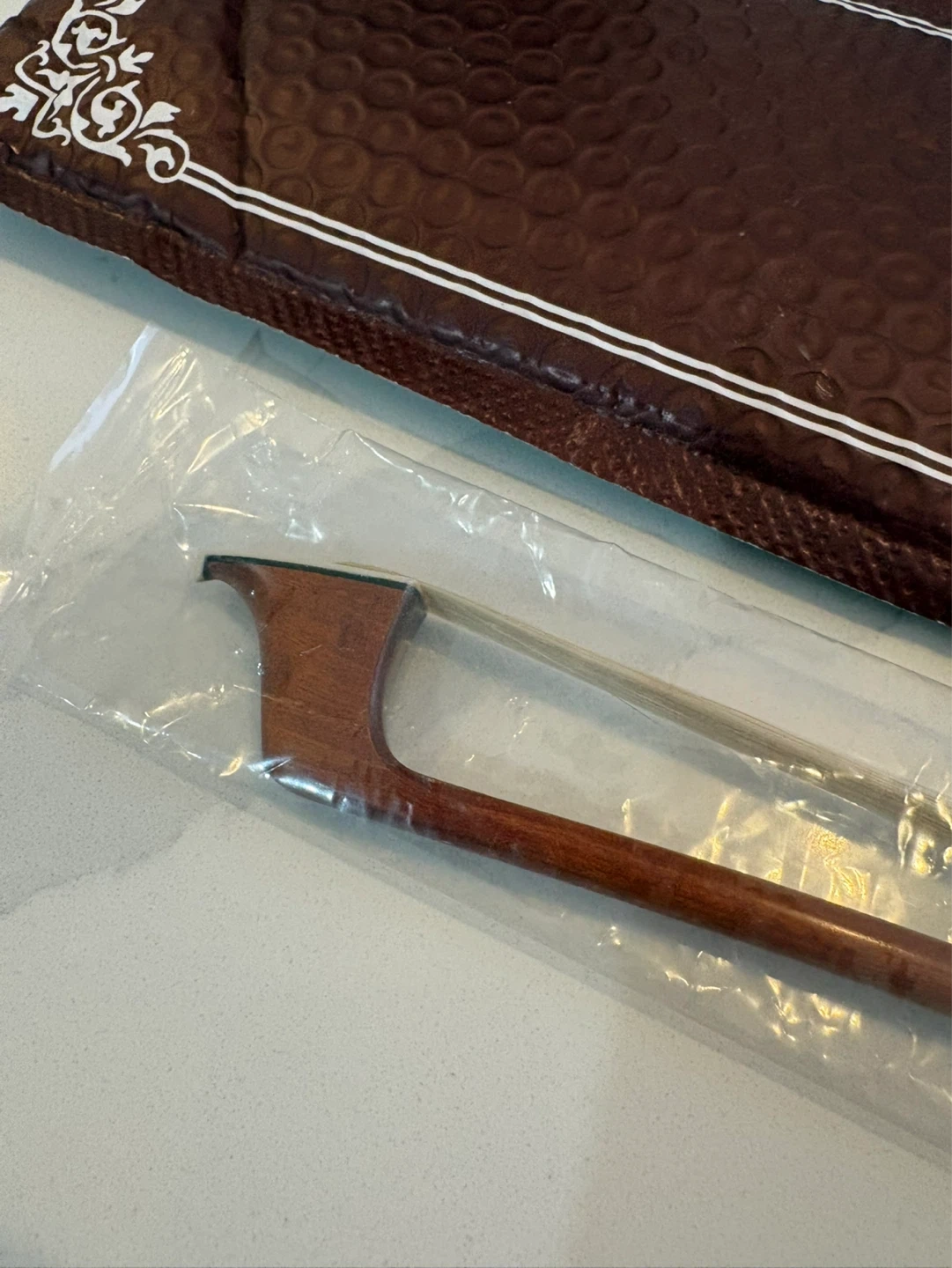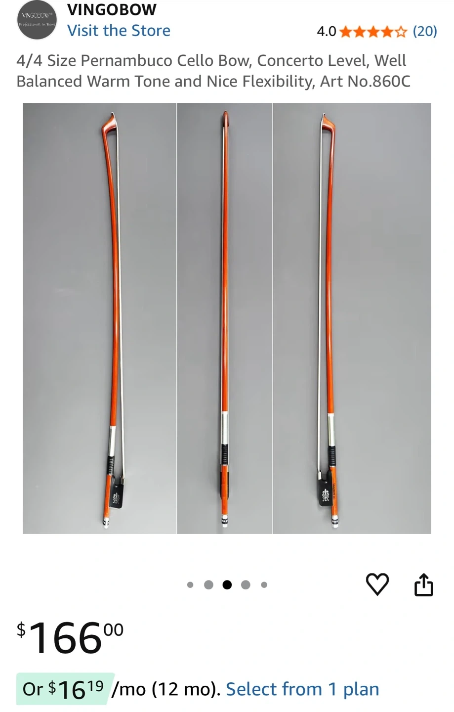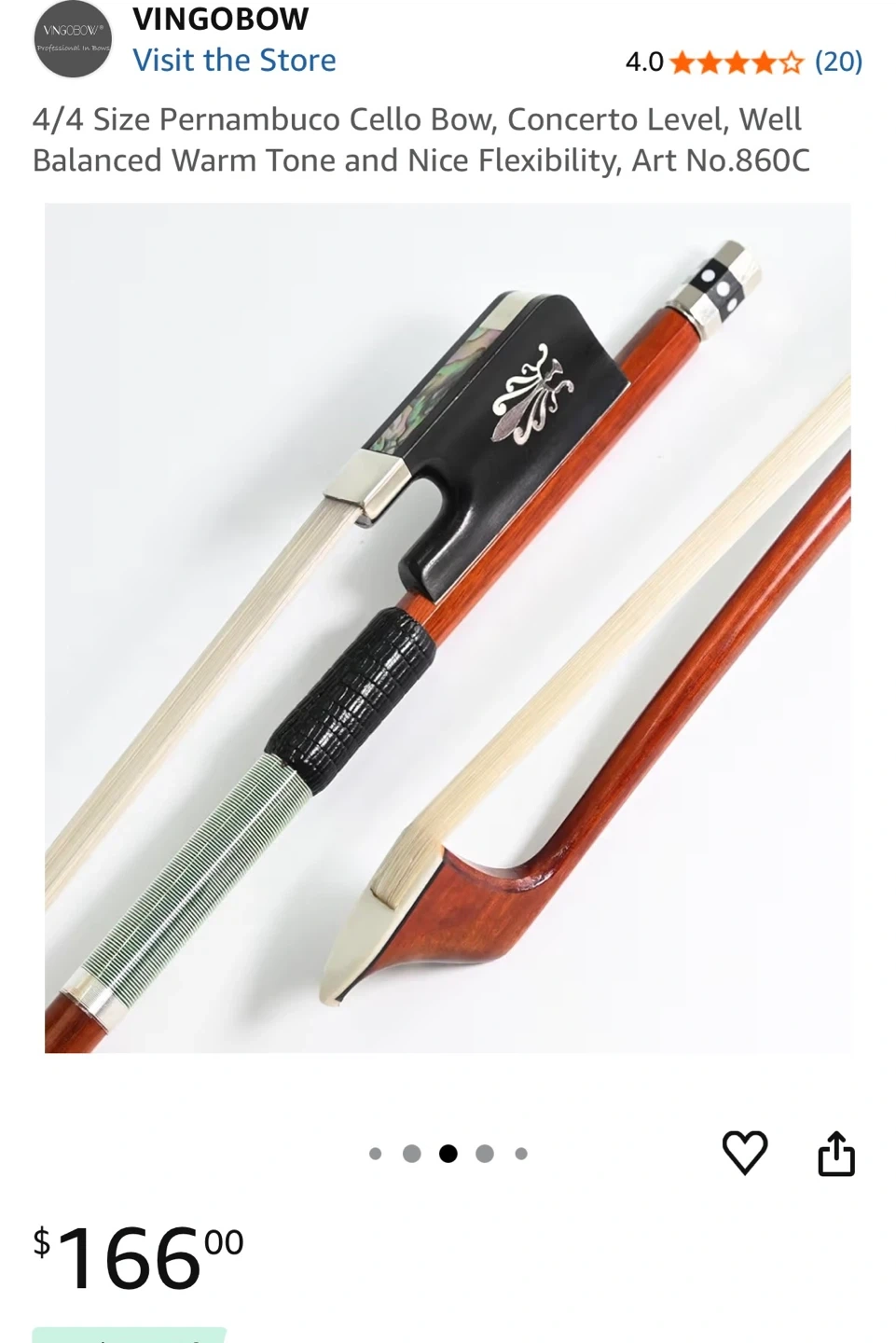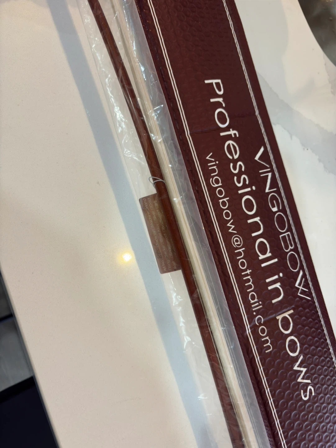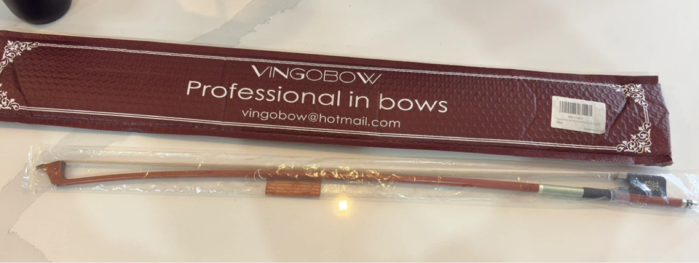This is a 4/4 size Pernambuco cello bow from VingoBow. It's designed for concerto level playing, offering a well-balanced warm tone and nice flexibility. The bow comes with its original packaging.