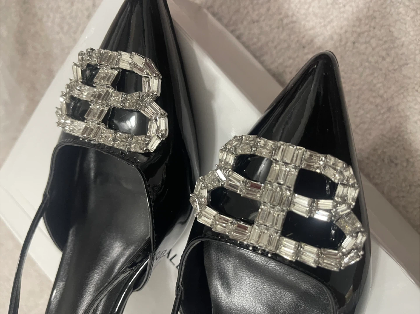 Selling a pair of Balenciaga black heels. They are size 37. The heels have a shiny, patent leather look and feature a decorative crystal "B" logo. They come with their original box!