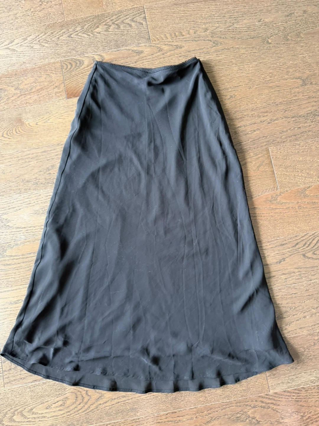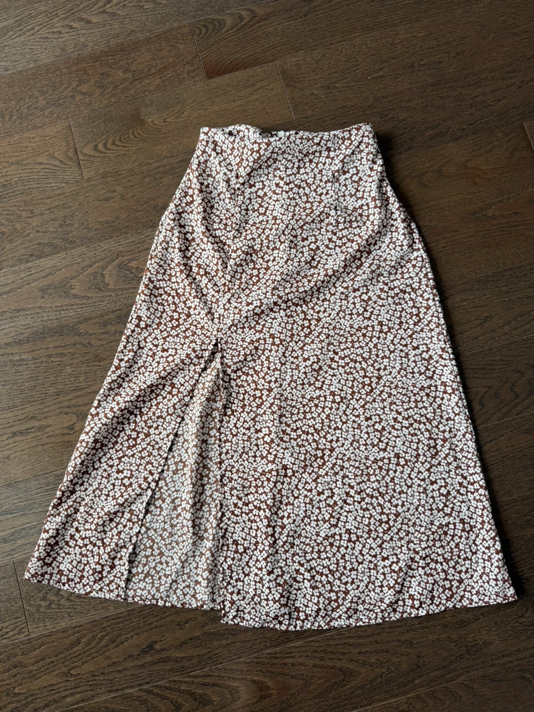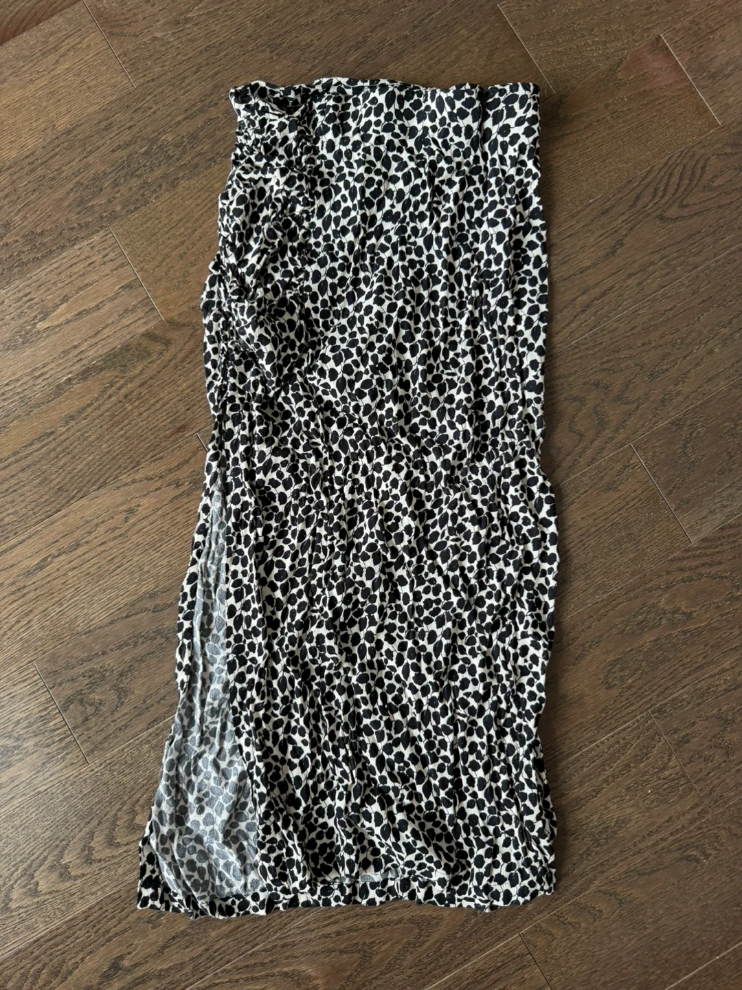 Three women's midi skirts featuring assorted prints. Includes one black, one with a leopard-like pattern, and one with a floral print. These skirts have a flowy design and a side slit. Everything 45$!!!