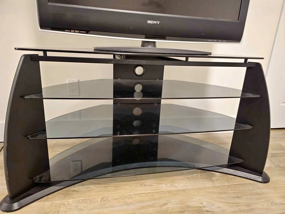Stylish black TV stand with curved tempered glass shelves and a solid frame. Sturdy, modern design—perfect for living room, bedroom, or entertainment area. Fits TVs up to 50–55 inches (approx.). 3-tier glass shelves for cable box, gaming console, sound system, or décor. Cable management holes at the back for a clean setup. Strong and stable construction. Good condition, clean glass, no cracks. Minimal, modern look that suits any décor. Best for small spaces, sits well in corners too.