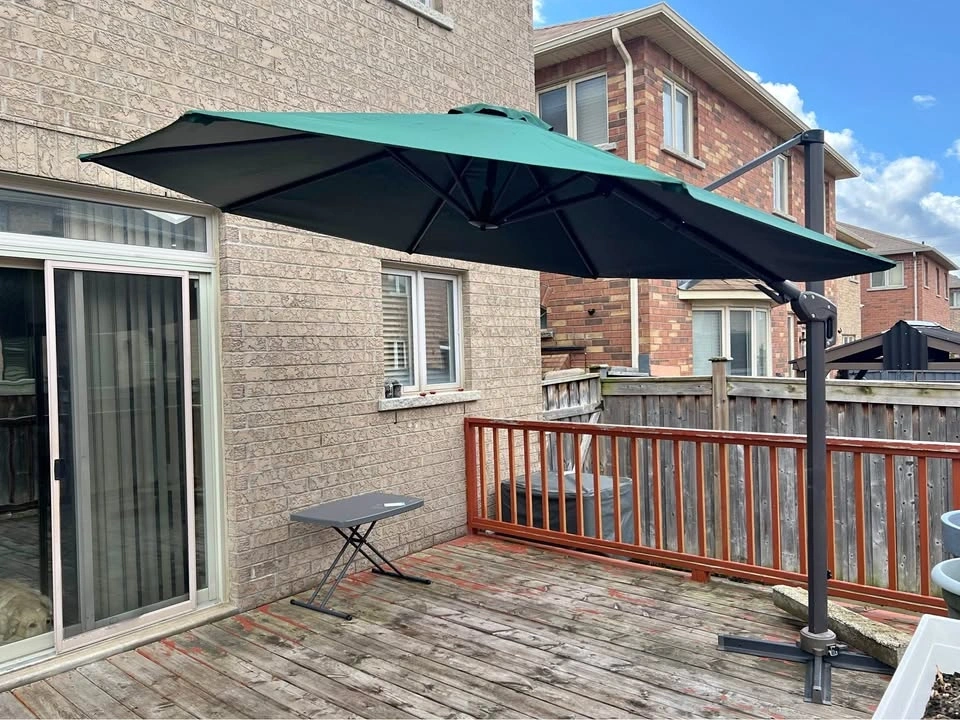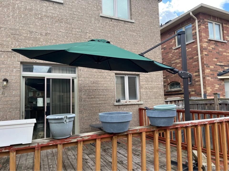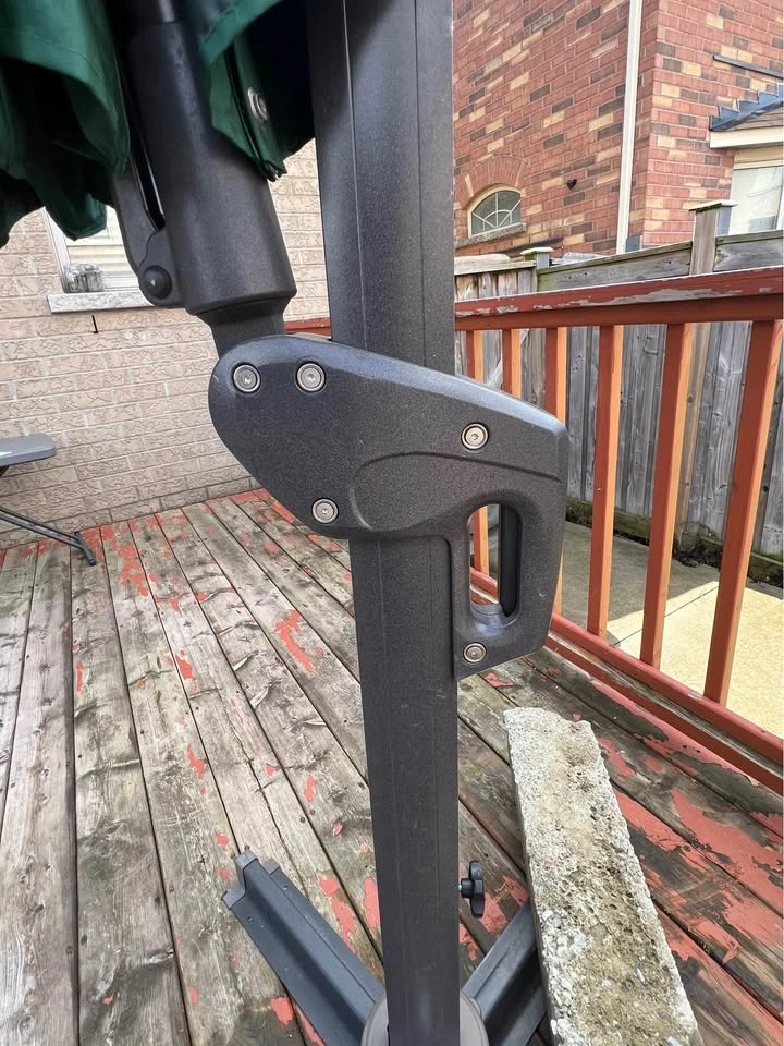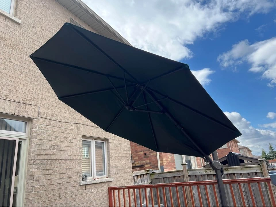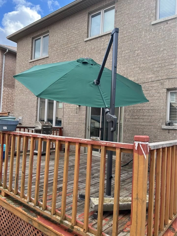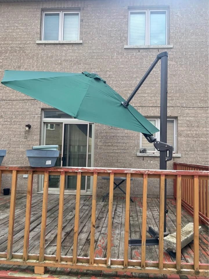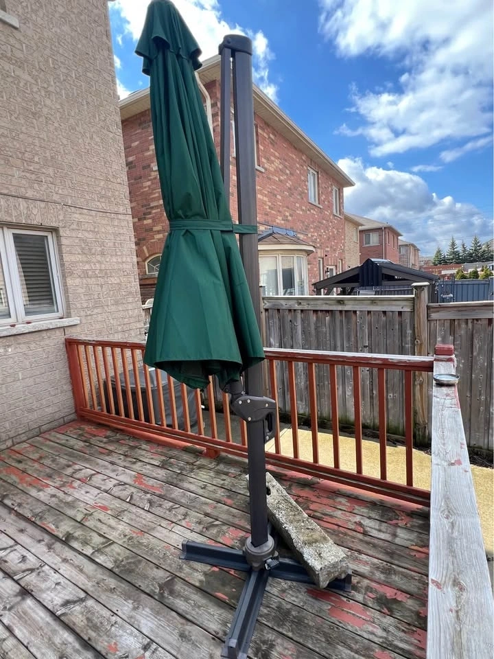 Excellent condition 10.5 FT patio umbrella. Barely used, almost brand new. Stored inside during winter. Works perfectly fine. No stains or rips. Comes with a base which can be bolted onto the floor or use heavy plates or sand bag or rock to hold it in place.