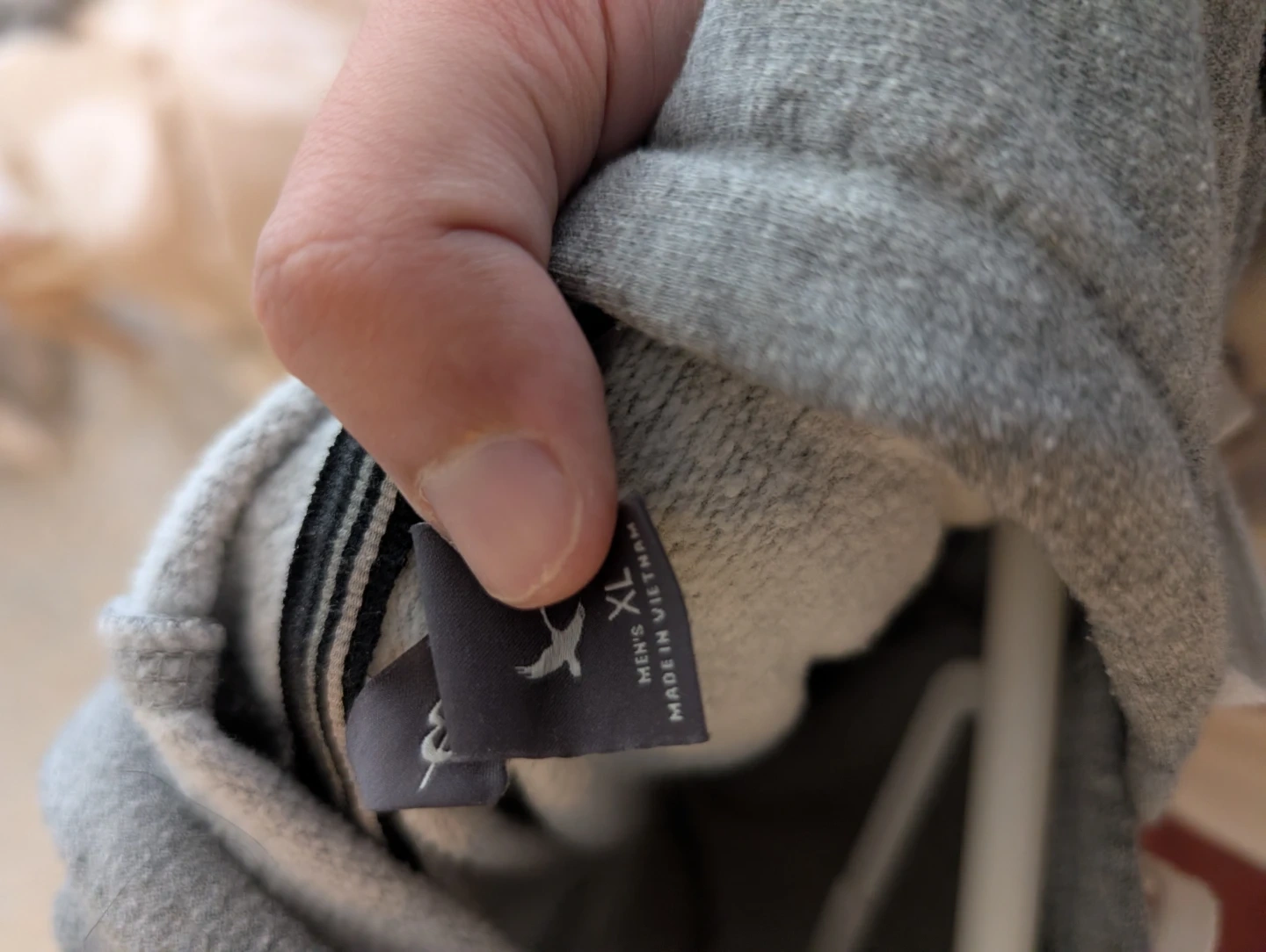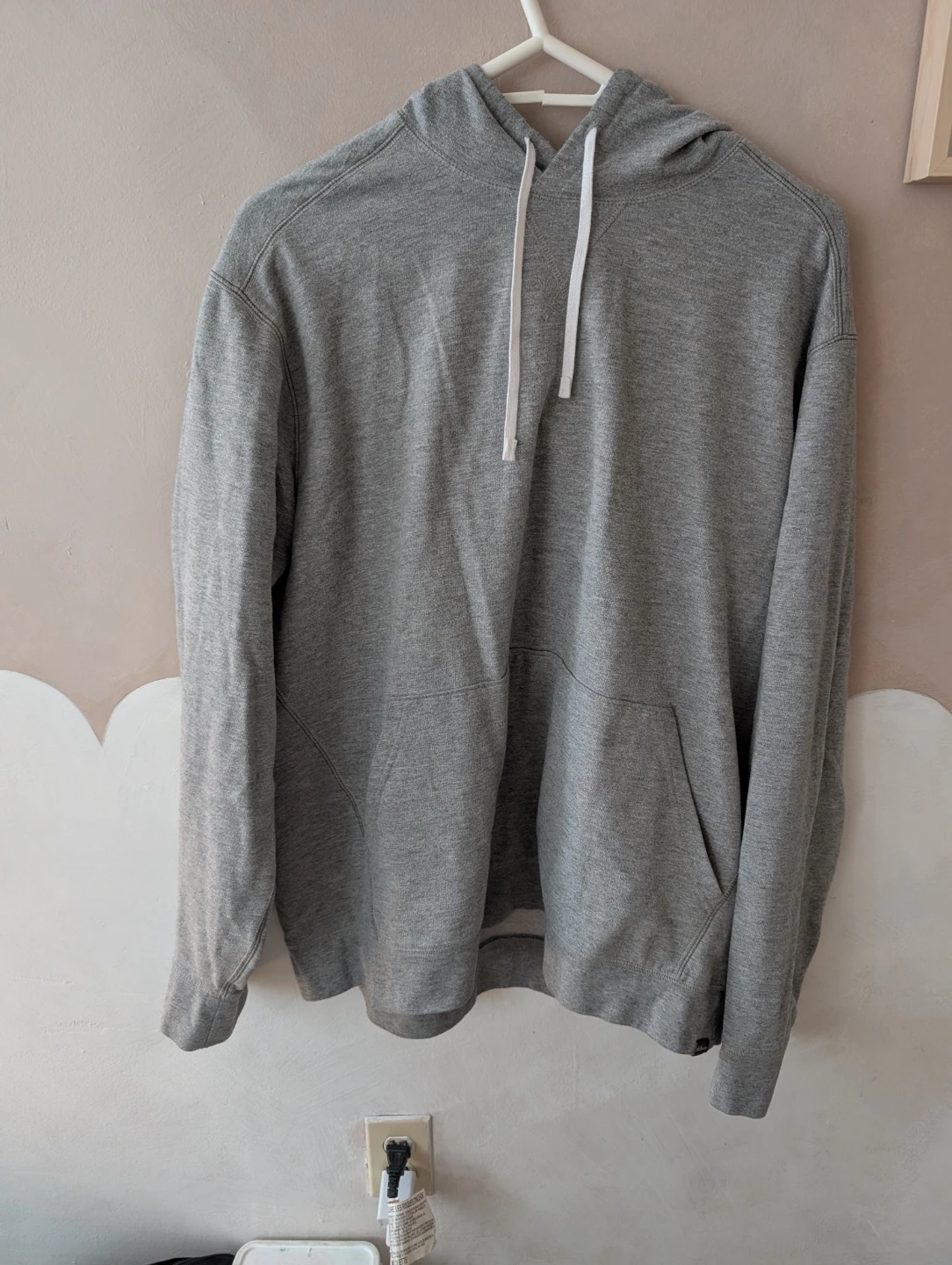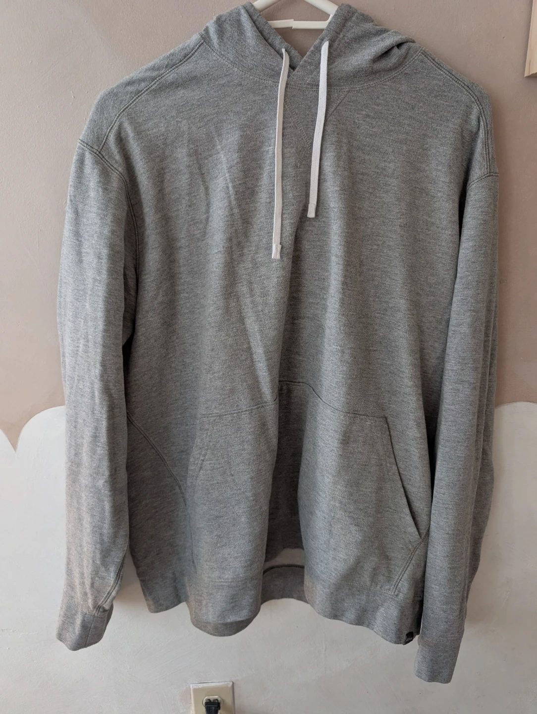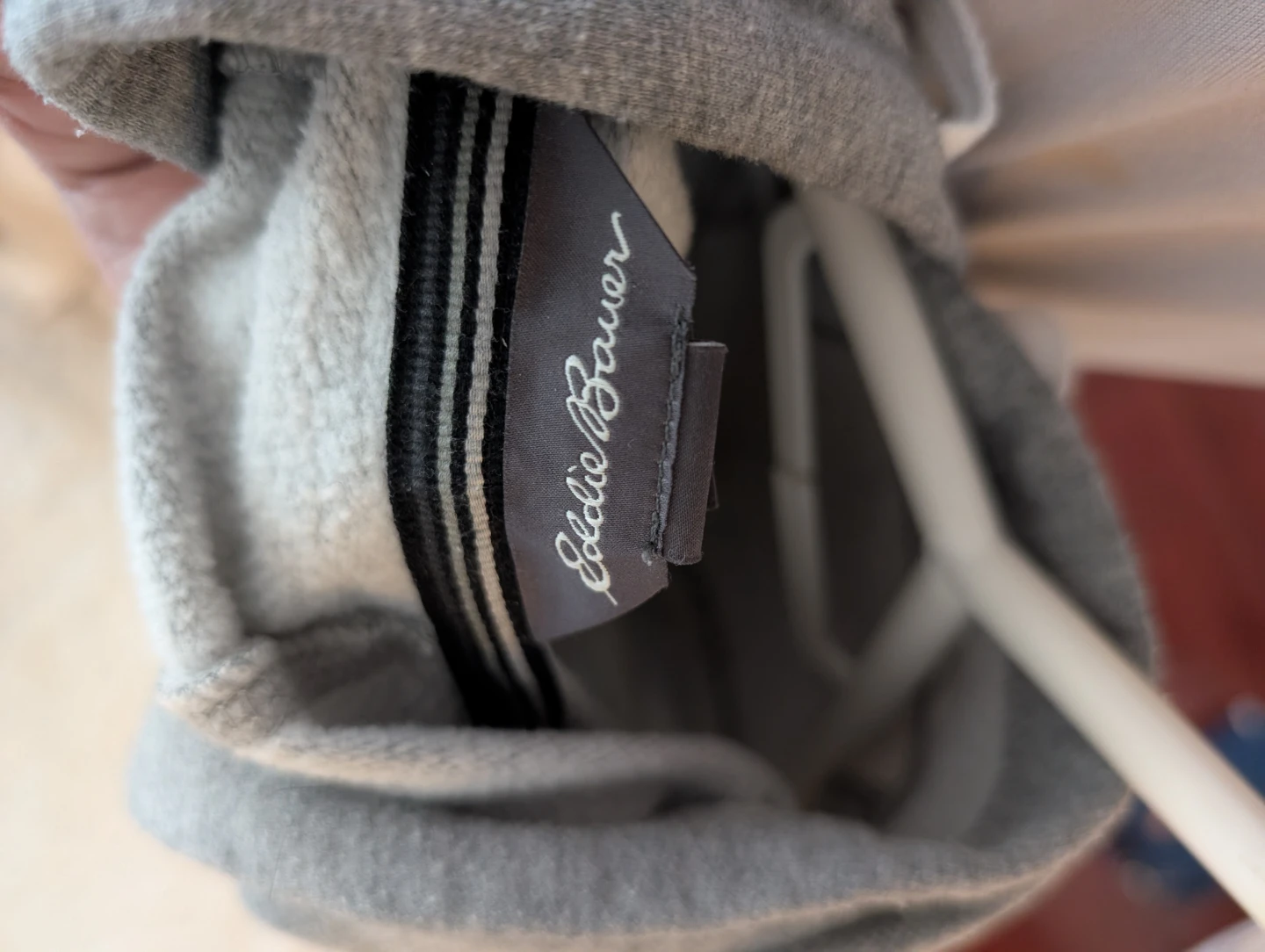 This is a men's grey hoodie from Eddie Bauer. It's a size XL and made in Vietnam. It features a kangaroo pocket and a drawstring hood.