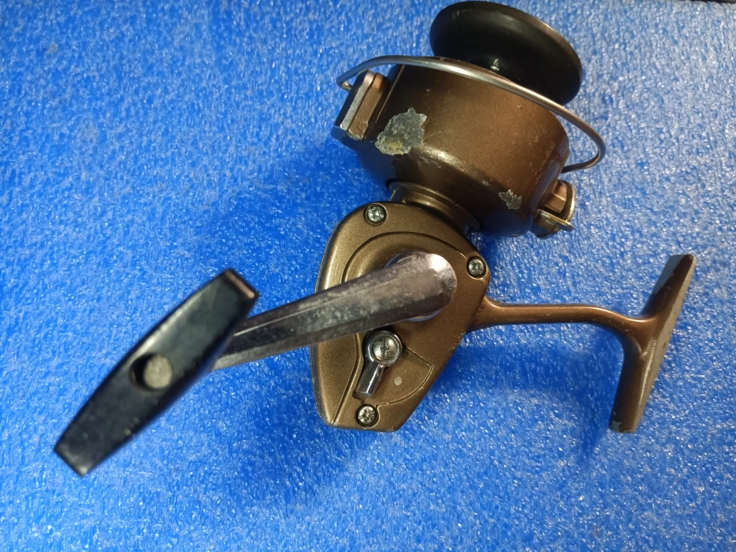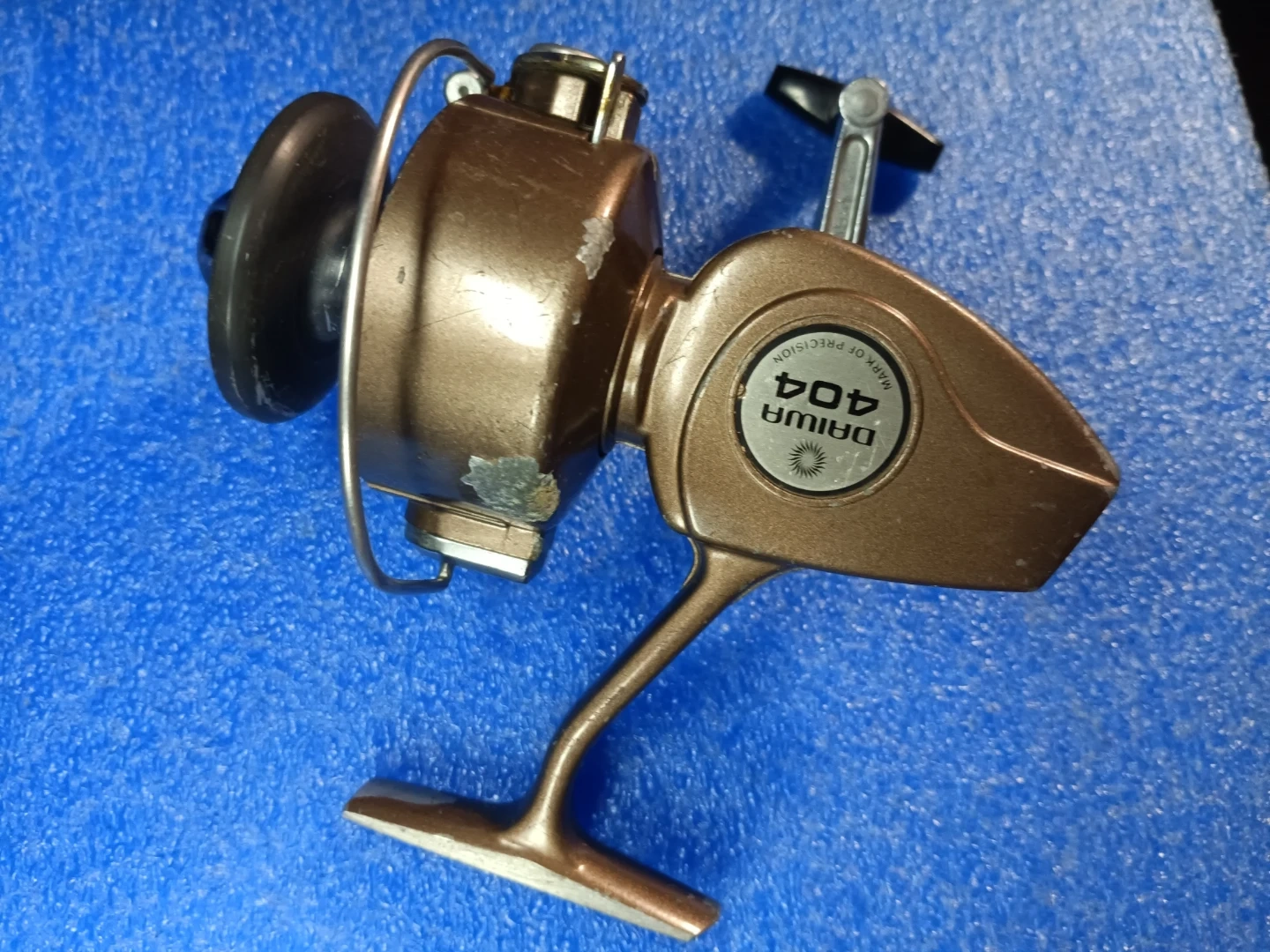 This is a vintage Daiwa 404 fishing reel. It's a classic piece for any angler's collection. The reel is bronze-coloured and appears to be made of metal.