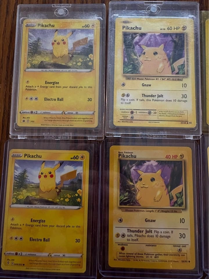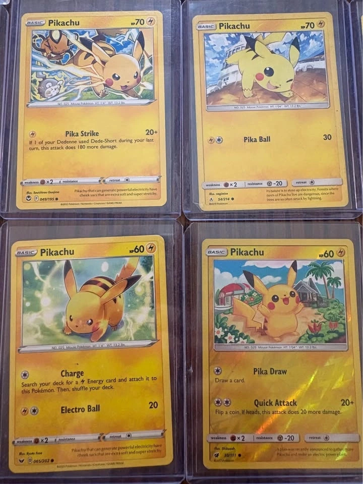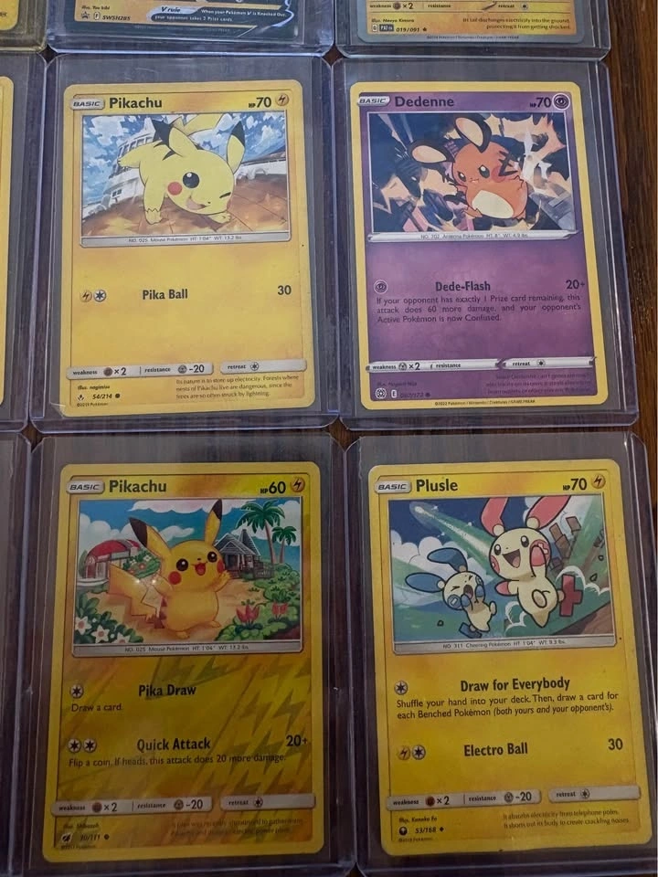 Selling a Pikachu-themed Pokémon card lot featuring 15 cards total. Includes multiple unique Pikachu artworks from different modern sets, Pikachu V, a Raichu holo, Plusle, and Dedenne. All cards are sleeved and in good condition (near mint to lightly played). Great for Pikachu collectors or binder displays. Asking $50 or best offer. Local meetup only.