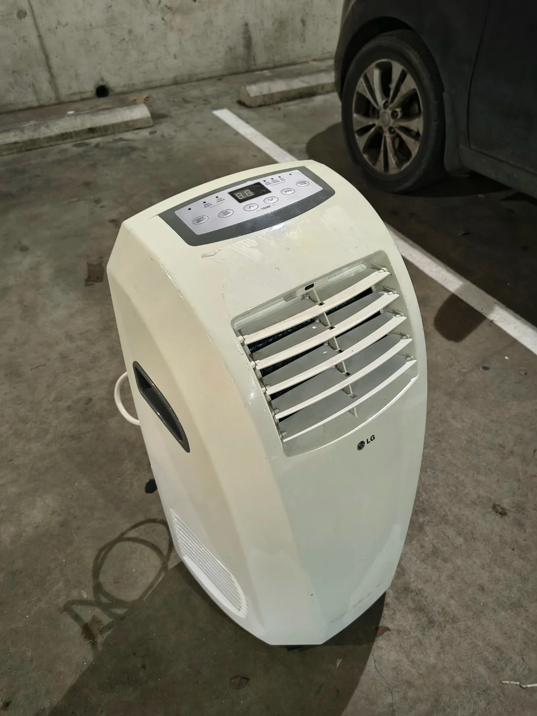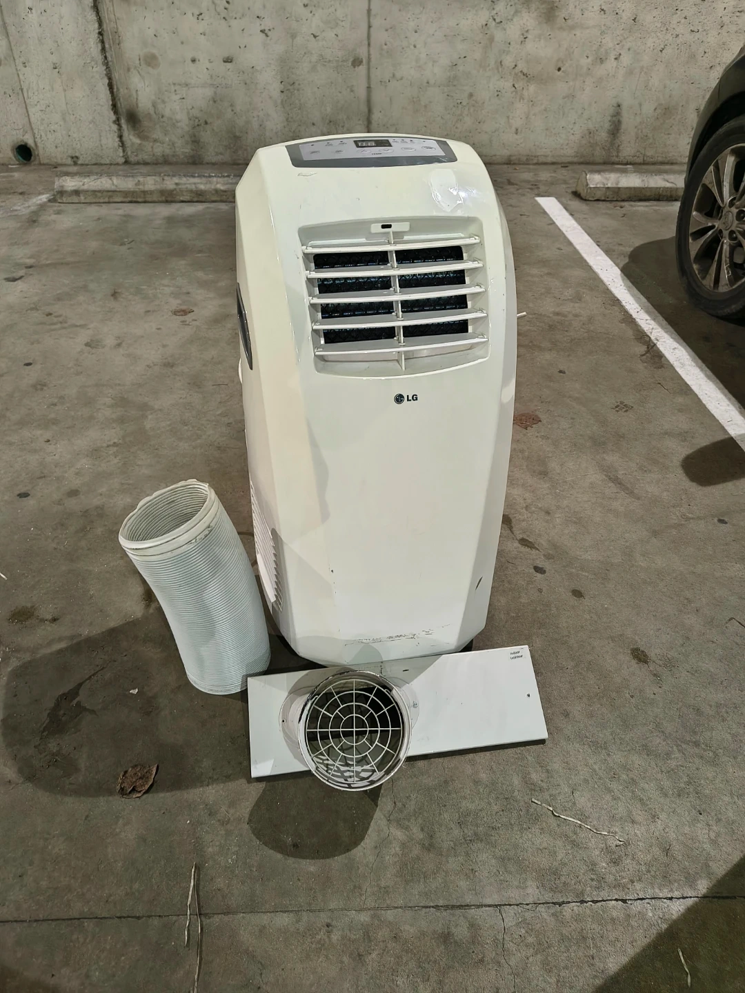 This LG portable air conditioner has a cooling capacity of 10,000 BTU/h. It's a 1080 W unit with a voltage of 115V. Includes exhaust hose and window vent kit.