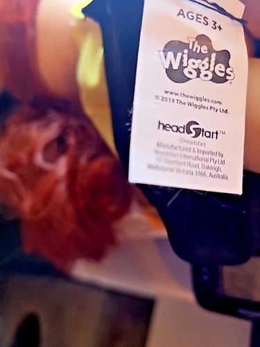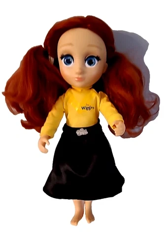 Wiggles Emma Doll Figure, an adorable 13-inch plaything that captures the charm of one of the beloved characters from The Wiggles. Crafted with a mix of materials, this doll features vibrant red hair, bright blue eyes, and a light complexion, accurately reflecting Emma's iconic look. The doll, produced in 2019. Great shape missing shoes.