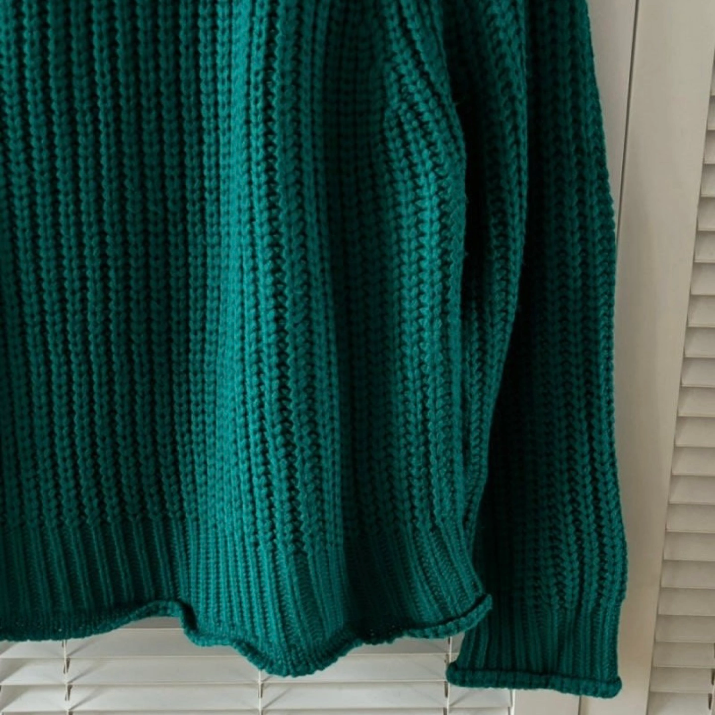 A beautifully textured vintage chunky knit sweater in a deep green shade. The thick ribbed knit pattern provides warmth and a cozy feel, making it a perfect addition to your fall and winter wardrobe. The slightly oversized fit adds to its relaxed and effortless charm.