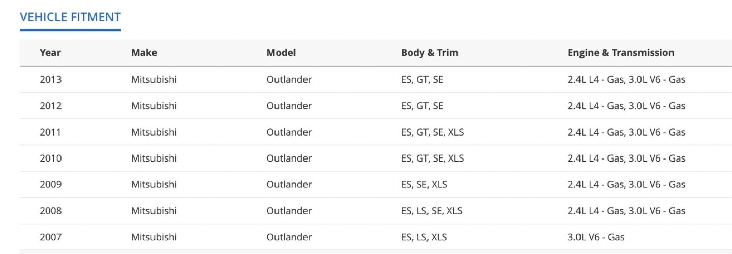 Used in a 2010 Outlander and should fit 2007 to 2013.