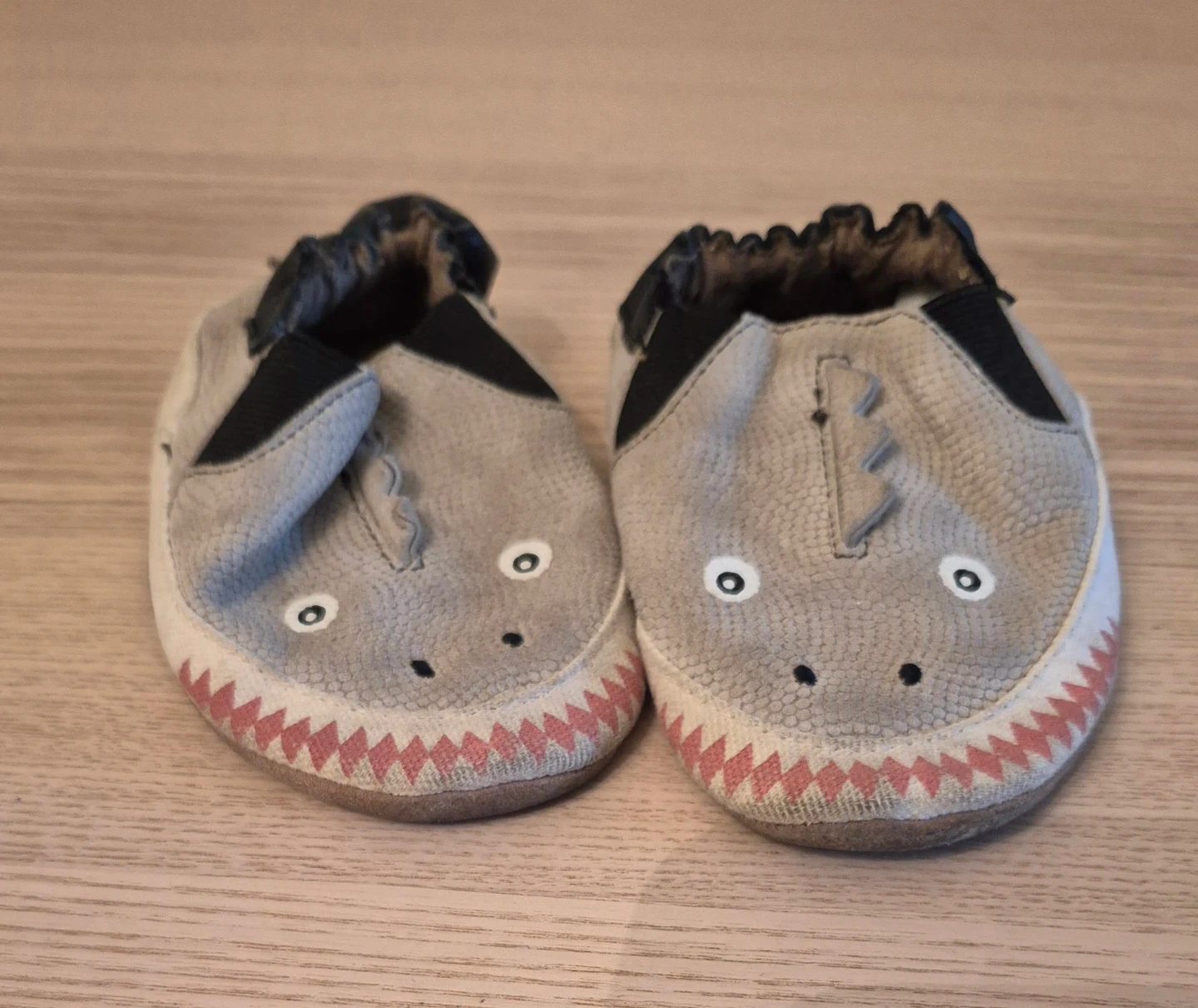 Cute shark-themed slippers for toddlers! These soft, comfortable slippers feature a fun shark design with little teeth details. They're perfect for little ones who love animals and want to stomp around the house in style. Size 18 to 25 months.